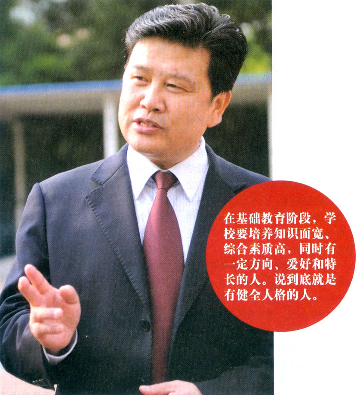 来到深圳育才中学当校长,他首先提出基础教育最重要的是打造“毛坯”而不是“精品”。就是说在基础教育阶段,学校要培养知识面宽、综合素质高,同时有一定方向、爱好和特长的人。说到底就是有健全人格的人。他说,基础教育的基础性,决定了基础教育是为人的健康、持续发展打基础,是为培养人才起奠基作用。
