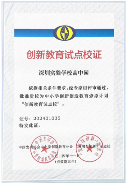 2024年11月8日,在中国发明协会中小学创造教育分会、《发明与创新》杂志社主办的2024全国中小学创新教育研讨活动中,我校高中部获评“创新教育示范校”、高中园获评“创新教育试点校”。