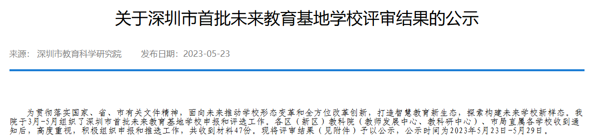 2023年5月23日,深圳市教科院公示了“深圳市首批未来教育基地学校”评审结果,我校初中部成功获评。
