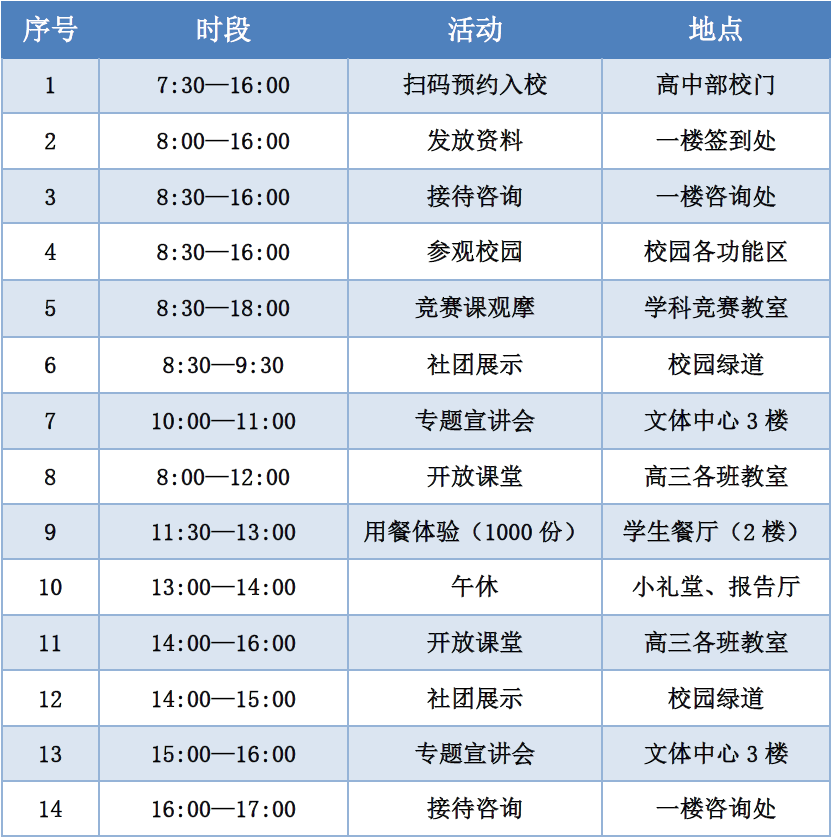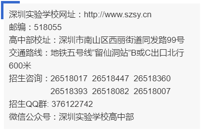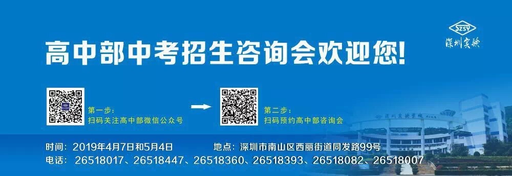 为进一步宣传深圳实验学校办学理念和办学业绩,让全市初三家长和优秀学子更好地了解深圳实验学校高中部,兹定于4月7日和5月4日8:00-12:00、14:00-17:00举行2019招生开放日宣传活动。届时,高中部将全面开放校园,展示教育教学活动,并在上午10:00、下午15:00各安排一场专题报告会,对高中部办学情况及招生政策进行全面介绍。此外,学校还将为同学们提供社团活动体验的机会,欢迎家长和学生关注高中部微信公众号,线上预约报名,凭身份证来校参观咨询。