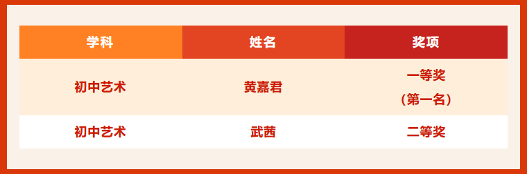 在深圳市第三届中小学幼儿园美育教师教学基本功比赛中,初中武茜老师获得市二等奖,黄嘉君老师获得市一等奖第一名。黄嘉君老师被推送至省里继续参赛,祝贺两位老师,祝贺王歆老师领衔的初中艺术学科组!