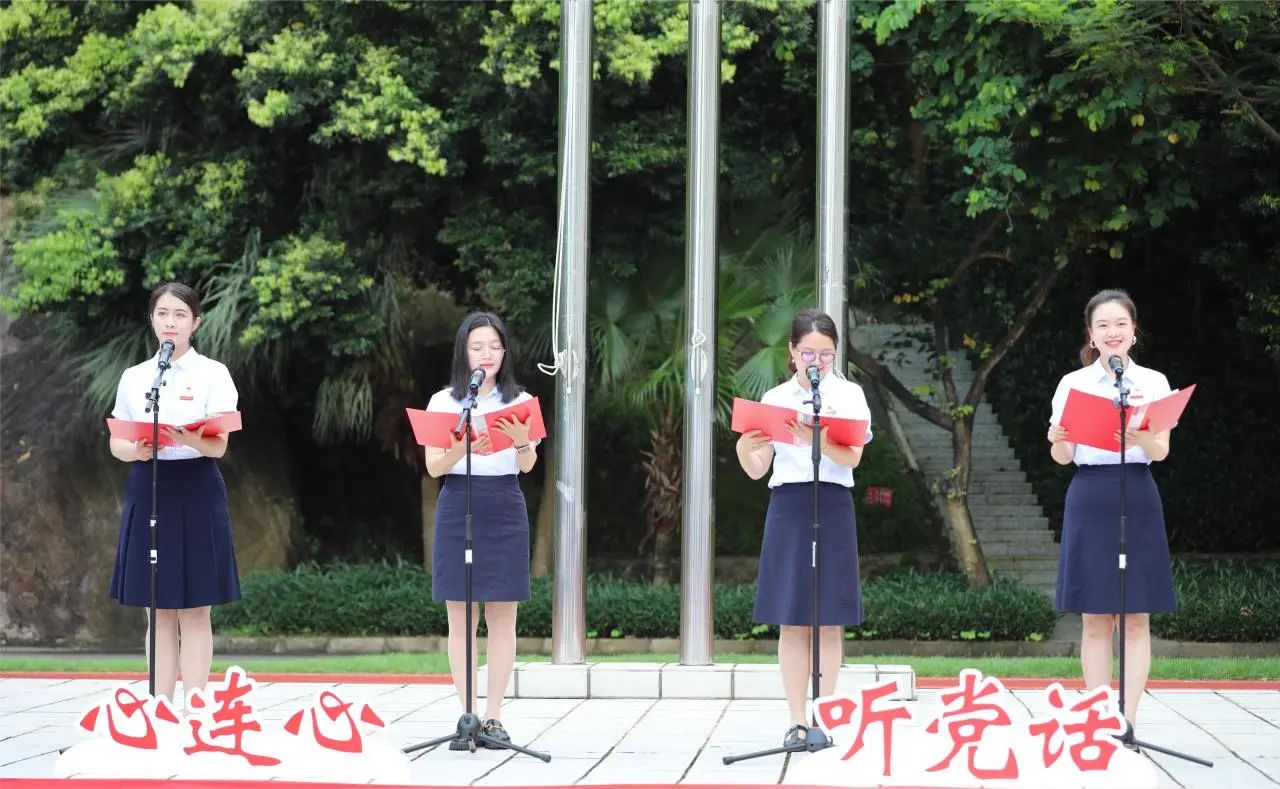 党员代表王晗、陈少俐、李虹、武茜带来了深情的诗朗诵《党旗颂》。“我来到党旗升起的地方,举目昂望。缔造伟大中国,实现伟大中国梦想,曾在这里起航……”铿锵激昂的朗诵声激发了大家的爱党热情,红色基因由此传承。