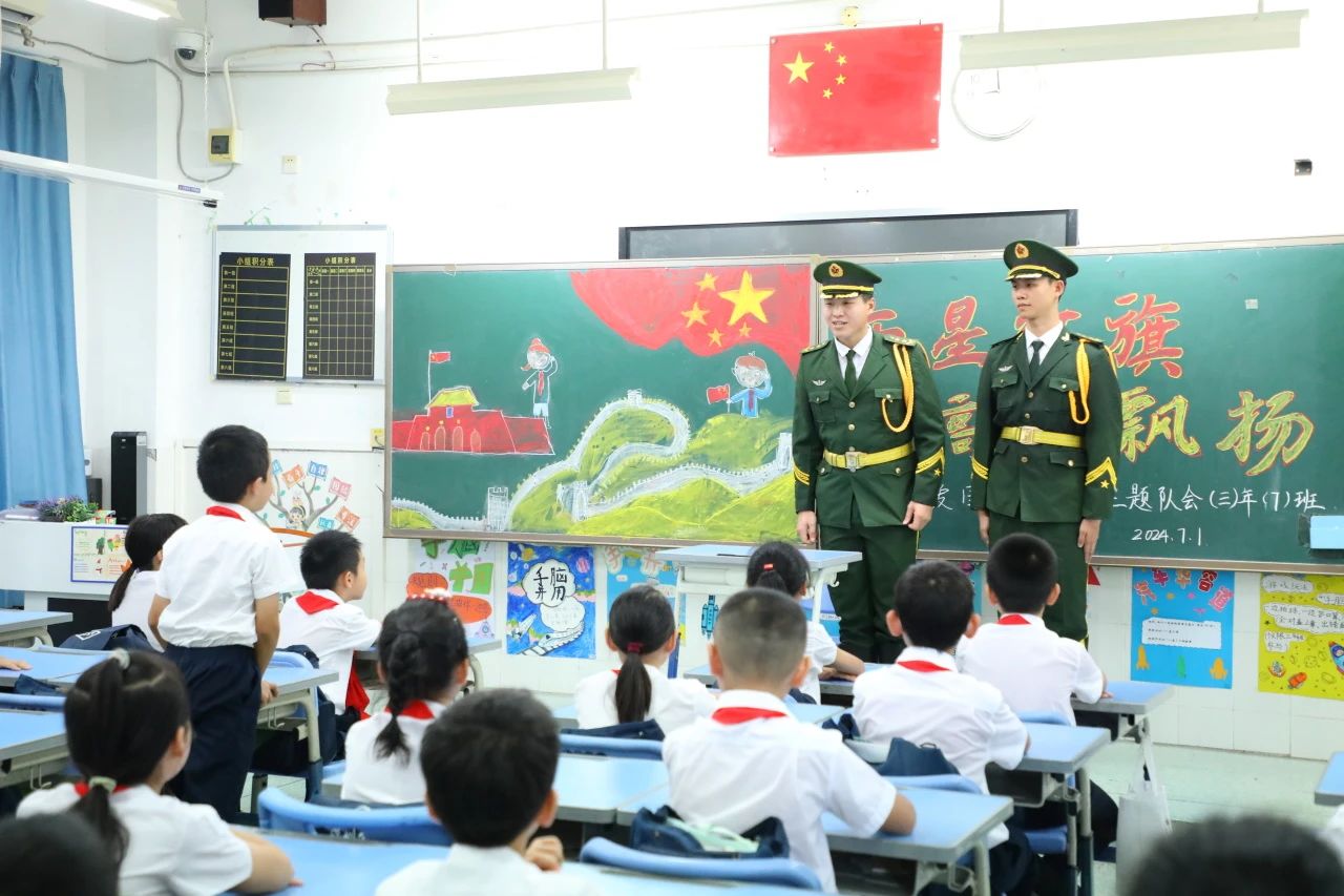 服务站退役军人走进小学课堂,向同学们介绍建党节的相关知识,并以自己结缘国旗的鲜活事例引导同学们知国旗、敬国旗、爱国旗。他们还详细讲解并示范升旗细节,引导同学们了解国旗知识,培养热爱国旗的情感。同学们认真听讲,十分入神。