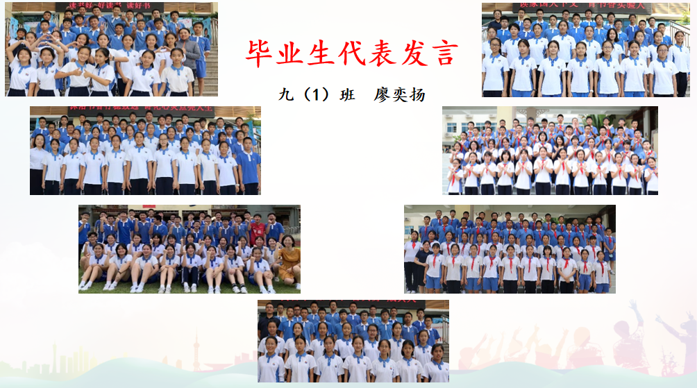总以为来日方长,殊不知时光荏苒。执笔于此,三年初中生活已经画上句号,在此,首先感谢亲爱的冯妈妈,记得您时常在我们放学时站在校门口送我们,对我们不尽体贴、关心,让我们坂田部学子开拓前进,不断学习。感谢老师们,您悉心教授予我的一切都将让我受益匪浅、终身受用。同时,感谢我亲爱的家人与朋友们,你们对我的照顾、关怀、包容与陪伴,让我充满力量。未来我将带着老师们的教诲与期望,亲友们的鼓励与支持继续前行,孜孜以求、不断探索。愿我们始终保持热爱、不忘初心,也祝大家毕业快乐,未来可期!