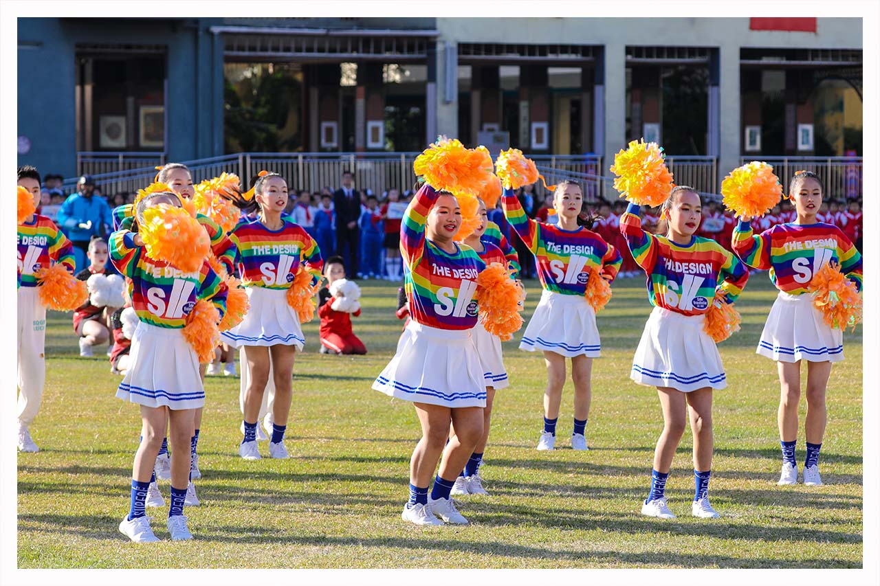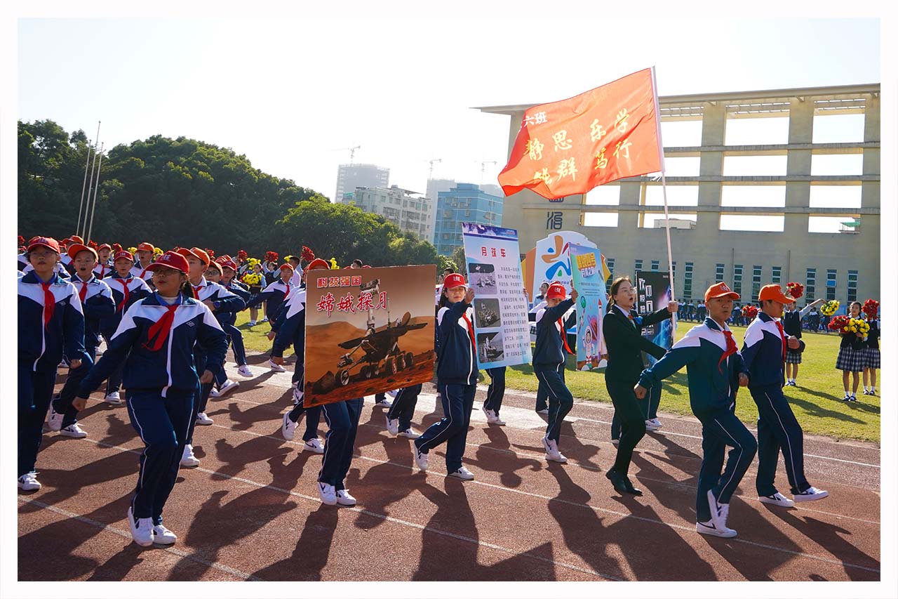 开幕式上,各年级师生以“红色血脉”为主线,贯穿“站起来”“富起来”“强起来”三大篇章献礼建党百年,以“追忆革命、童心向党”“峥嵘岁月、构建美好”“改革春风、花开遍地”“双奥圆梦、体育强国”“不忘初心、致敬英雄”“航天荣耀、科技复兴”“激情实验、勇攀高峰”为主题,层层递进演绎出中国共产党人历经百年岁月的精神传承,展现了中国发展的磅礴画卷。三旗一徽、教师裁判员方阵、九年级花束队和彩旗队方阵作为特色方阵先后登场,师生们昂首阔步、精神抖擞、口号响亮,点燃了全场的热情。