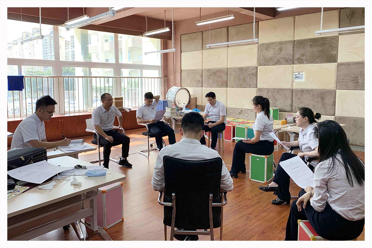 在备赛的一个多月里,音乐学科组勠力同心、集思广益,从教学设计到课堂实操,从形体展示到专业指导,学科组的同伴们帮助尤老师反复打磨、反复演练,甚至陪跑步、陪跳绳、陪练功。组内的男教师可以自己用针线帮助修改“裙子”;因新制作的教具尺寸过大,组内的女教师带上锯子、剪刀,连夜驱车返校修理,直到凌晨两点完成;因为要提升说课质量,组内的大哥们又调用资源,请来了专家精准指导。
