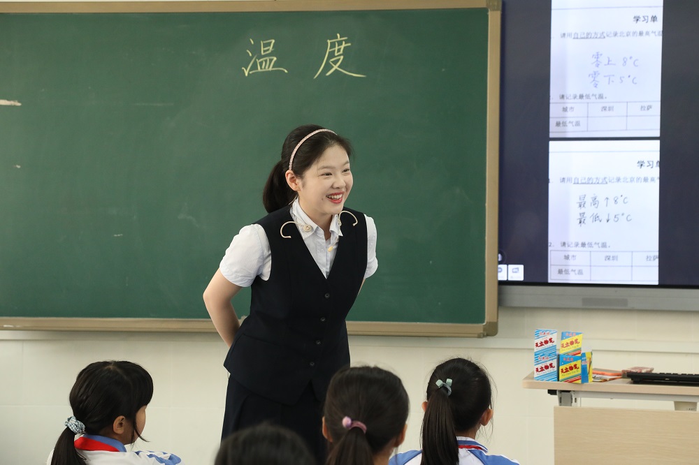 上午第三节,李倩怡老师为坂田部送教四年级数学课——《温度》。李老师用轻松愉悦“正话反做”的小游戏拉开了本节课的序幕;以深圳、北京气温为例,让学生用自己喜欢的方式记录天气播报的内容,以此引出用正负数表示温度的方法;通过让学生动手操作“温度计”学具和汇报展示,理解温度的意义;以层层递进的问题启发学生思考,深化学生对温度计分界点零度意义的理解;以猜温度游戏结尾,巩固了本节课的知识,发展学生能力。短短的一节课彰显了李老师扎实的教学功底和独特的语言魅力,其极具亲和力和人文关怀的教师形象亦给听课老师留下了深刻的印象。