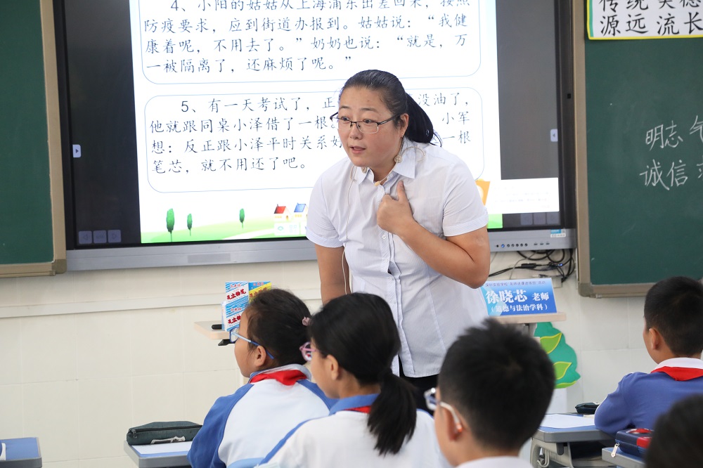 25日上午第一节,徐晓芯老师执教的五年级道德与法治课——《传统美德 源远流长》以中华美德歌为导入,巧用教材中的四个小故事,总结出明志、气节、诚信、求新等自强不息的人格修养,结合社会主义核心价值观,重点探讨了“诚信”这一中华民族传统美德,配合视频播放加深学生对诚信与失信的认知。徐老师设置的“你倒我接”小游戏,让学生体会到信任与被信任的美好感受。徐老师的课堂组织形式轻松愉快,学生讨论热烈,发言积极,在她极富亲和力的引导下,同学们对诚信有了更深刻的理解。板书设计以“诚信树”为主框架,诚信小妙招为树叶,极富生命力。