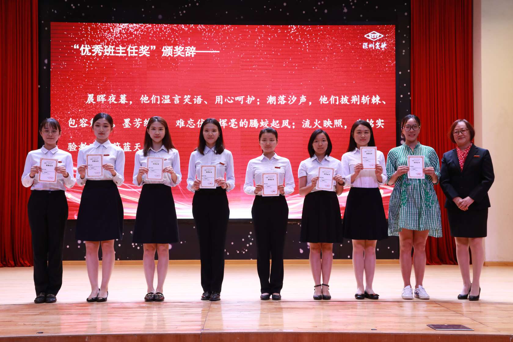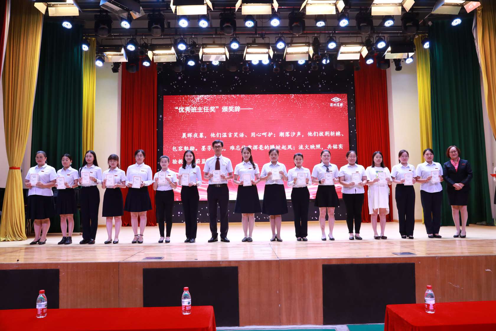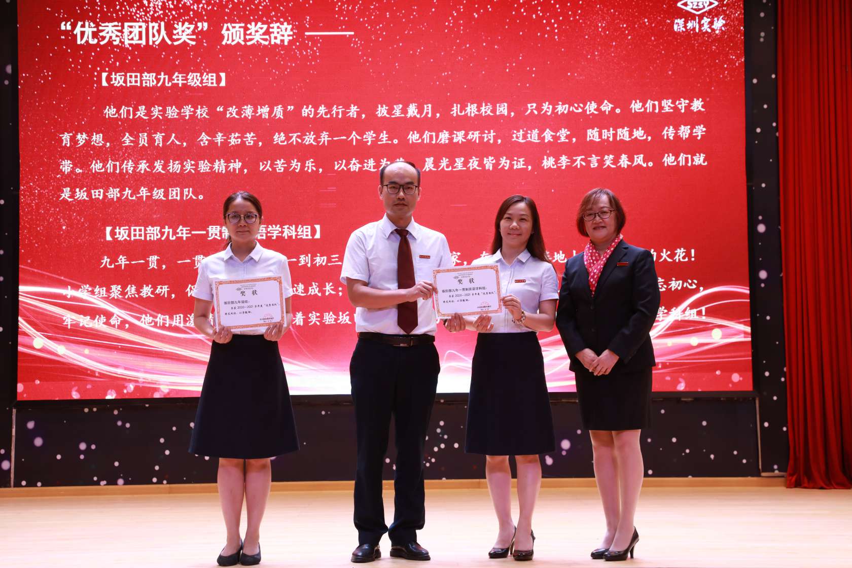 凝心聚力,潜心育人,扎根校园,坚守初心。九年级团队和九年一贯制英语学科组获得“优秀团队”的荣誉称号。作为实验学校“改薄增质”的先行者,九年级团队披星戴月,含辛茹苦,以苦为乐,以奋进为荣。晨光星夜皆为证,桃李不言笑春风。九年一贯制英语学科组从小一到初三,分组不分家,在各自的阵地上燃烧智慧的火花。小学组聚焦教研,促进青年教师迅速成长;初中组紧盯中考,助力学生实现高中理想。教师代表李虹老师、英语科组黄艳老师、许磊老师上台接受表彰,冯校长为他们颁奖。作为团队带领人,李虹老师分享了出色的中考成绩背后的点滴真情,“九年级不仅仅是一个抽象的团体,更是一个个具体鲜活、身体力行、传承实验文化、实践教育理想的人。我们送出去的孩子,在心中孕育着‘成为中华民族脊梁’的种子,带着“人格健全、学业进步、特长明显、和谐发展”的实验基因,这就是我们‘改薄增质’的亮眼答卷。