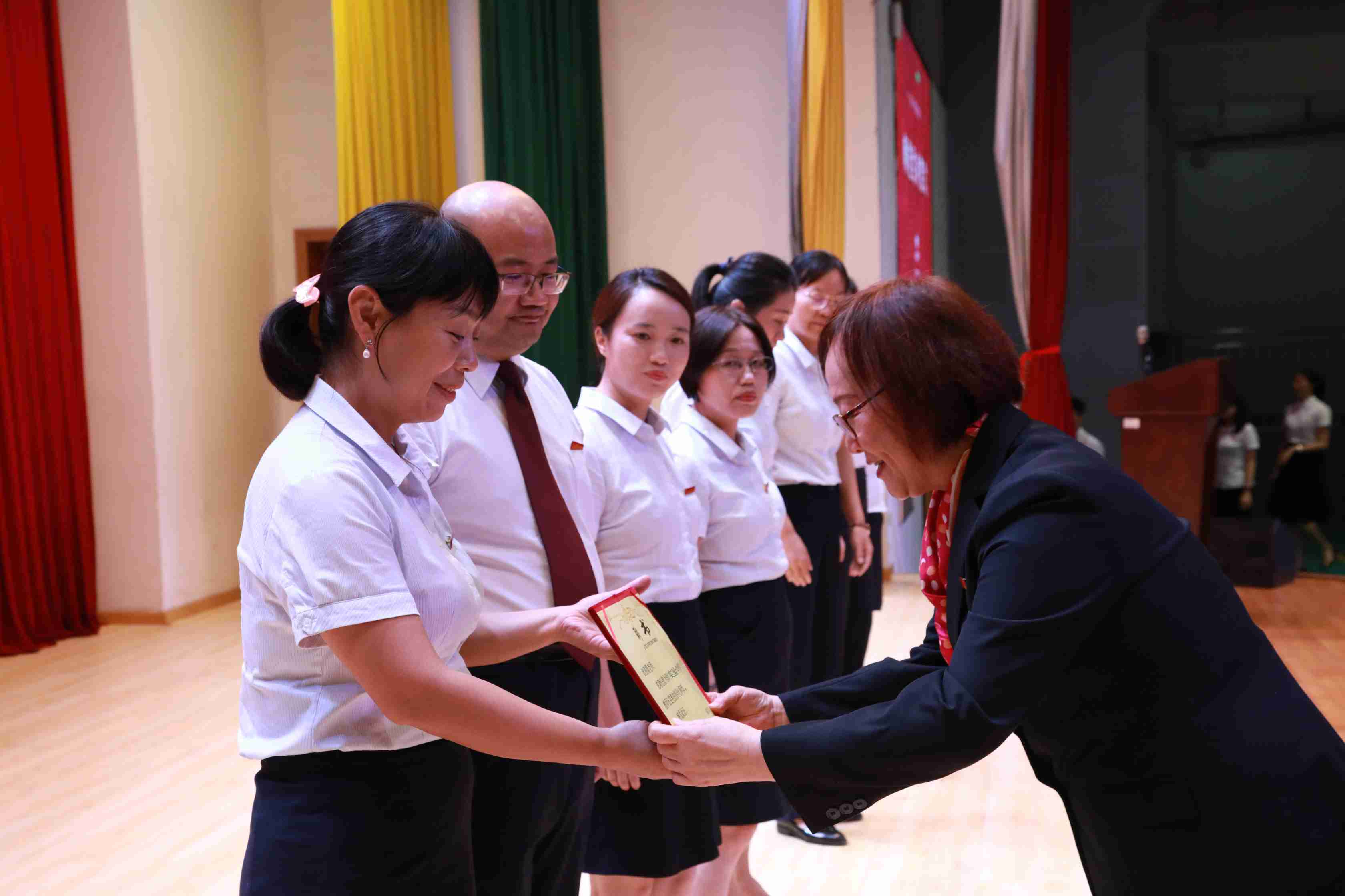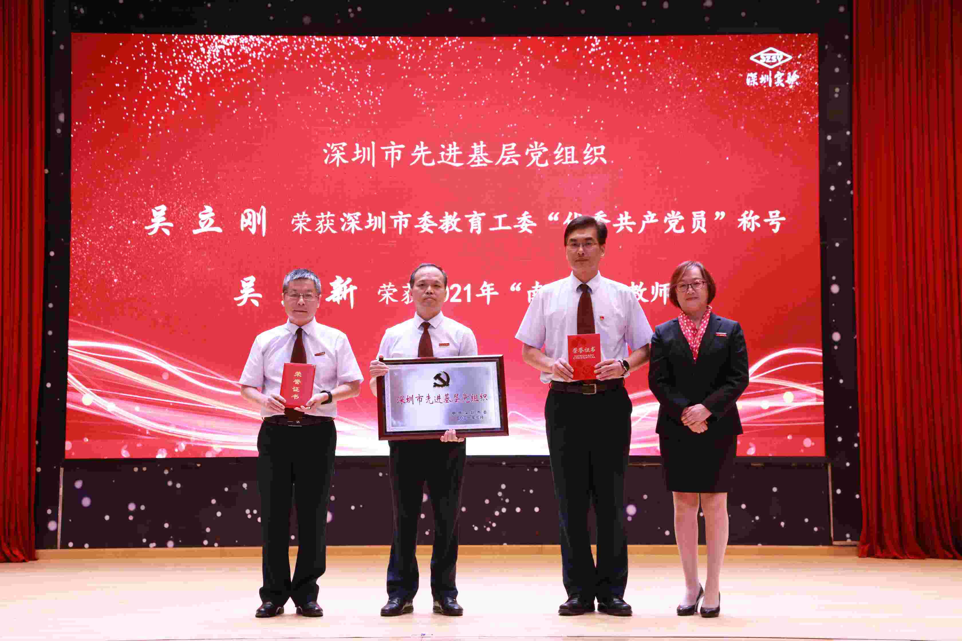 艰难见品性,勇毅显精神,党建引领,干部带头。坂田校区党总支旗帜鲜明,团结奋进,传承实验文化,积极打造品牌。一系列党建工作与教育教学深度融合,展现了坂田实验人攻坚克难、改薄增质的奋斗精神。党总支班子成员加班加点解决疑难杂症,干部们率先垂范、冲锋在前。今年7月,坂田校区党总支被深圳市委评为“深圳市先进基层党组织”,吴立刚主任被授予“深圳市委教育工委优秀共产党员称号”,吴立新主任被授予2021年广东省“南粤优秀教师”称号。吴立刚主任、吴立新主任、胡联辉主任上台接受表彰,冯校长为他们颁发获奖证书,三位主任分别发表了获奖感言。
