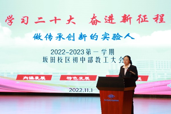 坂田校区初中部赵晓主任首先回顾本学期开学以来各个年级、各个科组以及全体老师们的工作:老师们克服重重困难,完成了新校区的搬迁;防疫和线上教学混合教学两手抓,老师们都熟悉了多种授课方式;青功赛,以赛促研,各个科组厉兵秣马,团结备赛,取得了较为优异的成绩。