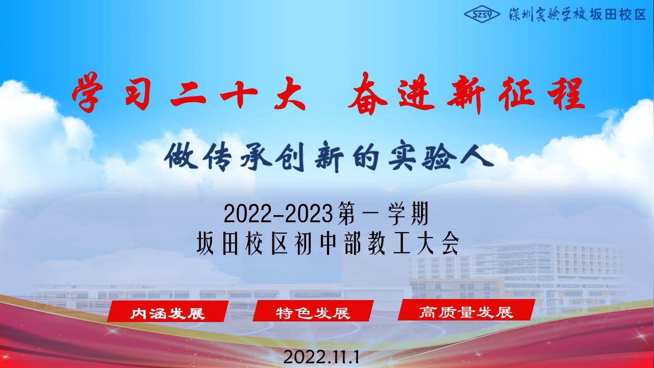 如何深入学习党的二十大会议精神,深刻领悟习总书记为教育擘画的宏伟蓝图,思考坂田校区初中学段的教育教学工作,始终牢记“励精图治”的校训,赓续实验文化,传承实验精神,在学校提出的“四大高地建设”“五个示范”中再立新功,11月1日下午,深圳实验学校坂田校区初中部在新校区报告厅召开全体教职工大会,主题为《学习二十大 奋进新征程 做传承创新的实验人》。深圳实验学校副校长、坂田校区执行校长王喜峰出席了大会,全体教工参加。