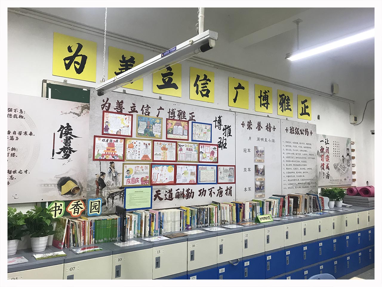 主题板报氛围浓,班级翰墨书香飘。看,书香班级里有整齐的书籍、清晰的借阅章程、漂亮的古诗贴画……同学们日日被经典环绕,时时读圣贤诗书。一块块字迹工整、图文并茂的板画向学生传递着读书乐趣,一个个校园小书法家的作品令人叹为观止。