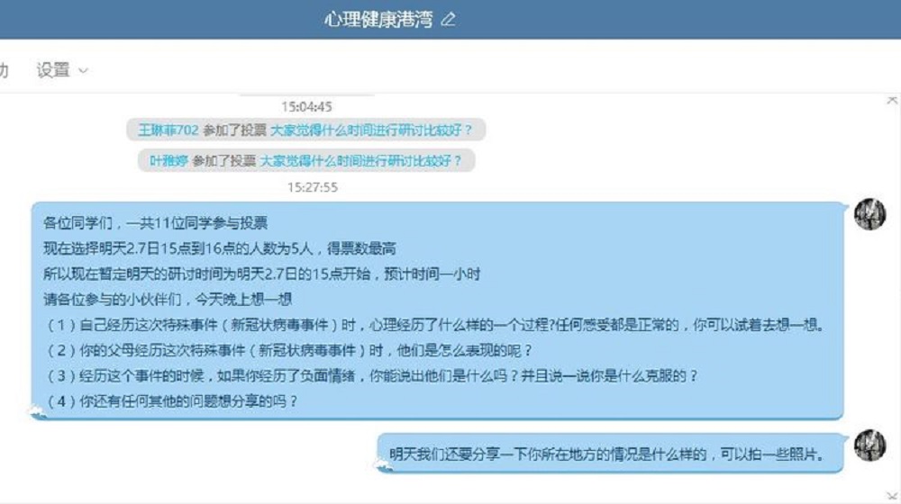 接下来张老师又了解了社团成员及父母居家防疫的情况并建议大家要以平常心面对,在做好防范的同时消除不必要的恐慌情绪,通过一些活动适当调节家庭氛围,如:和家人一起做手工,玩你画我猜游戏,与朋友线上猜谜,学习做饭等。