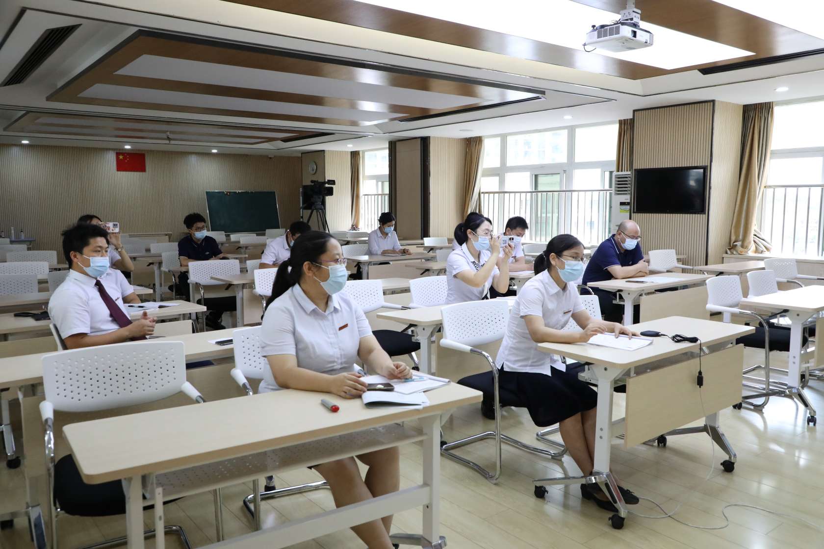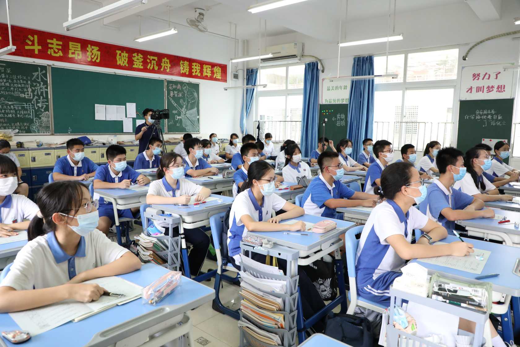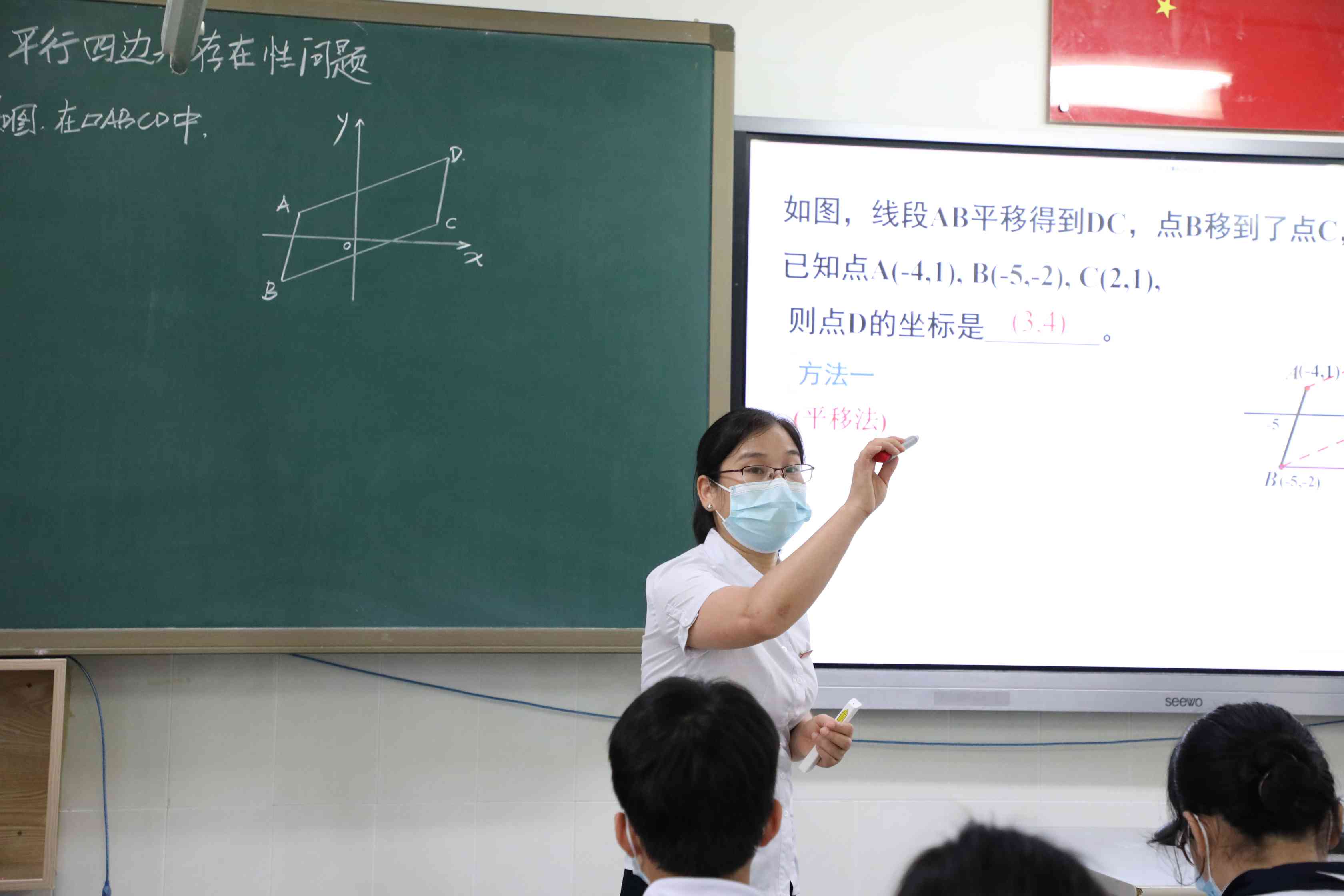 我校中青年骨干教师刘春梅老师以平面直角坐标系为内容,在八(4)班开展线下线上混合教学公开课《平行四边形存在性问题初探》。青年骨干教师刘峰老师在九(7)班开展线下线上混合教学公开课《特殊角的三角函数应用(续)——12345 模型》。两位老师精心设计,呈现了两节精彩的数学课。通过腾讯课堂,两校老师全程同步观摩了线上线下课堂。