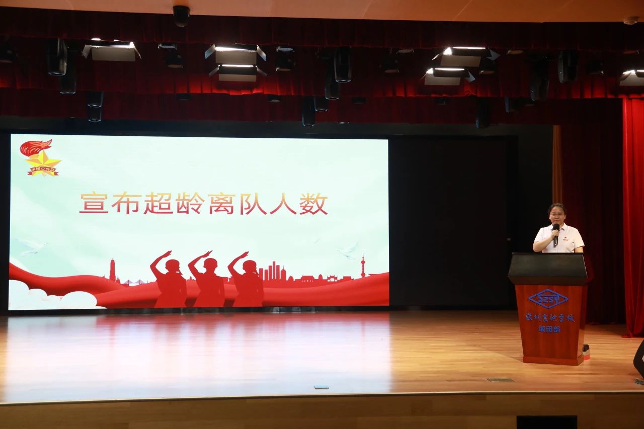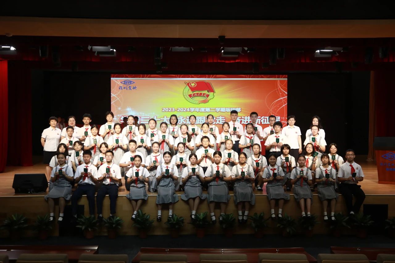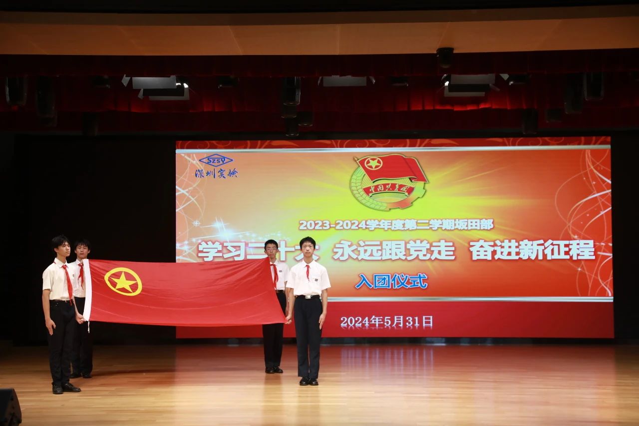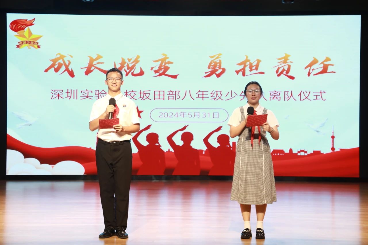 为弘扬“五四”精神, 展现青春朝气和风采,2024年5月31日,深圳实验学校坂田部隆重举行“成长蜕变 勇担责任”离队仪式和“学习党的二十大 永远跟党走 奋进新征程”入团仪式,进一步激励全校团员青年继承和发扬以爱国主义为核心的五四精神。