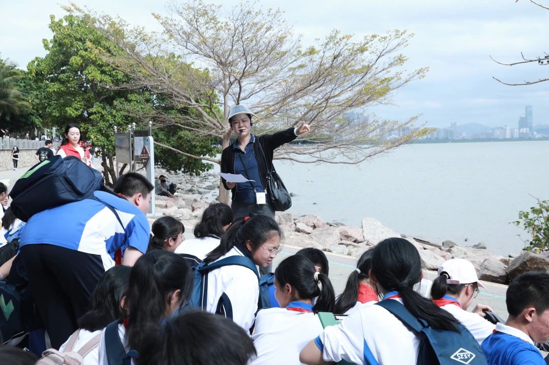 踏入深圳湾公园,同学们仿佛进入了一座天然的自然博物馆。地理老师结合现场环境,讲解了深圳湾的地理位置、地形结构及其在粤港澳大湾区的重要生态地位。生物老师则带领大家观察红树林和候鸟,深入剖析它们之间的生态关系。同学们认真观察红树林错综复杂的根系,了解到这些根系不仅稳固了红树的生长,还为众多生物提供了栖息和繁殖的场所。