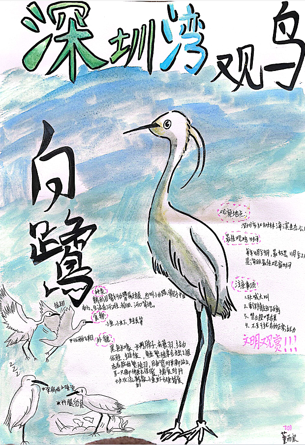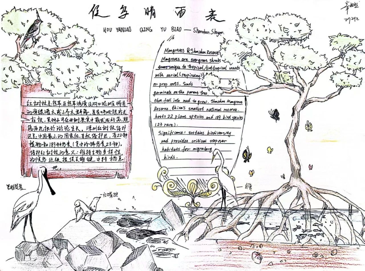 同样的深圳湾公园,不同年级的同学们却有着不同的收获。三年级的同学们绘制鸟类名片,介绍我的鸟类朋友,开启了自然启蒙;五年级的同学们调查红树的朋友圈,绘制红树的食物网,思考了生物间的关联;而七年级的同学们则结合前置课堂知识,对候鸟与红树林生态系统的关系进行了更深入的探究。