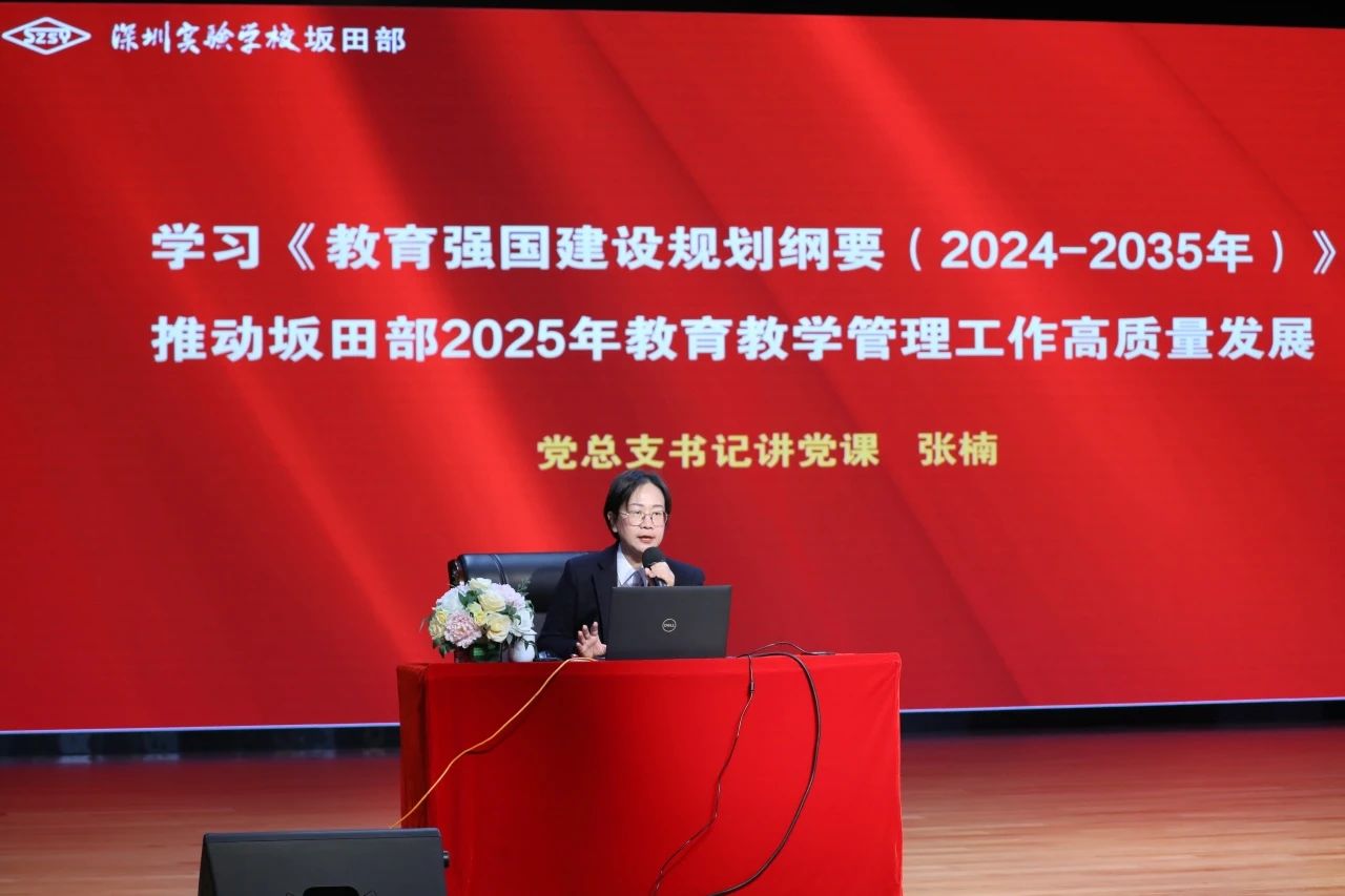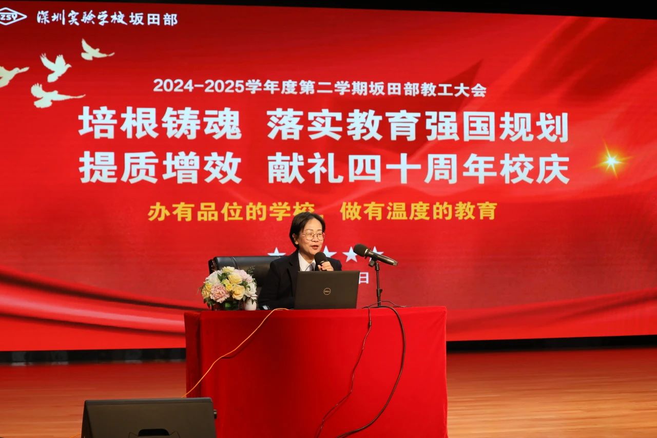 2025年2月11日,深圳实验学校坂田部在报告厅隆重举行了新学期全体教职工大会。此次大会以“培根铸魂,落实教育强国规划 ;提质增效,献礼四十周年校庆”为主题,围绕“办有品位的学校,做有温度的教育”,全面部署了新学期的教育教学工作,展现了坂田部在人工智能突飞猛进的新时期敏锐的教育眼光,和传承实验文化办好人民满意的教育的深切情怀。