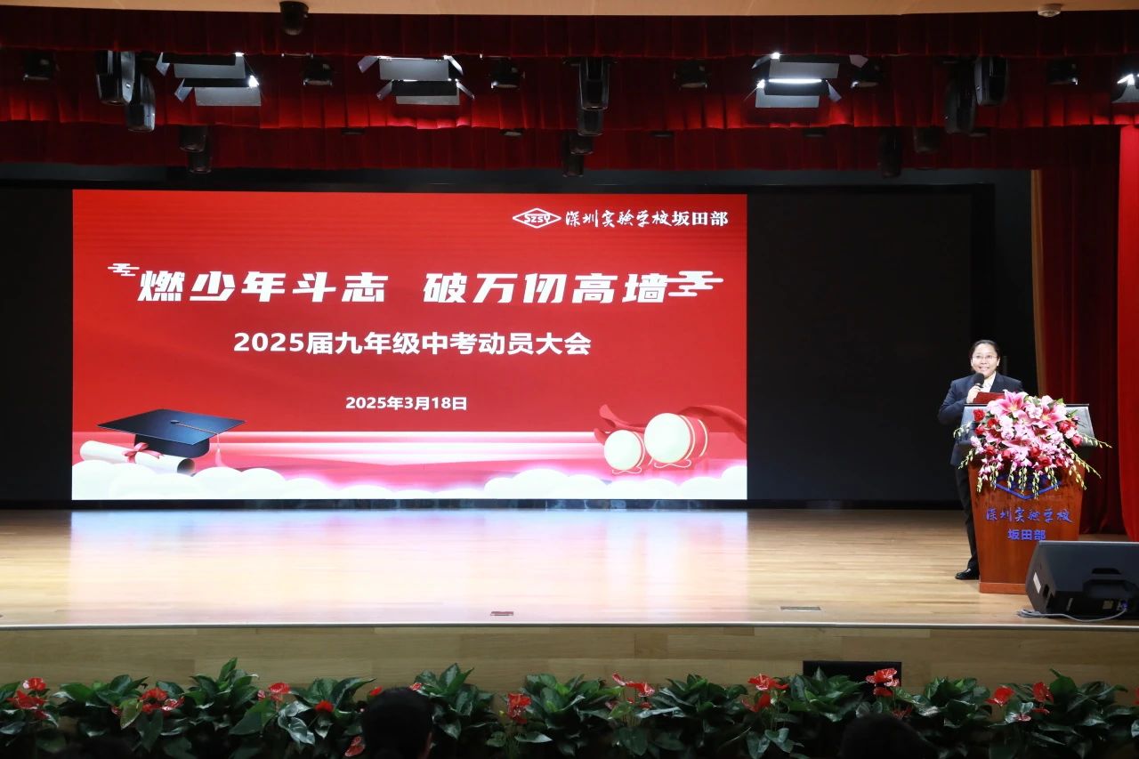 携九载锋芒,战百日时光!3月18日,深圳实验学校坂田部召开2025届九年级中考动员大会。本次大会旨在激发九年级师生以满腔的热情和坚定的斗志投入到中考复习中,勇敢地面对人生的挑战。初中行政、九年级全体师生及家长代表、六八年级学生代表、小初教师代表共同参与了这次动员大会。
