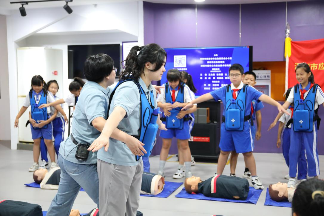 来到人工急救实操馆,基地讲解员金老师首先通过一个视频详实地给学生们介绍了心肺复苏的适用场景和操作方式,然后再给学生们进行现场教学。学有所练,金老师邀请了10名学生上前实操练习,学生们踊跃参与,现场学习氛围浓郁。