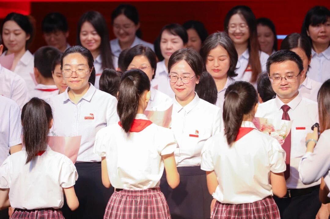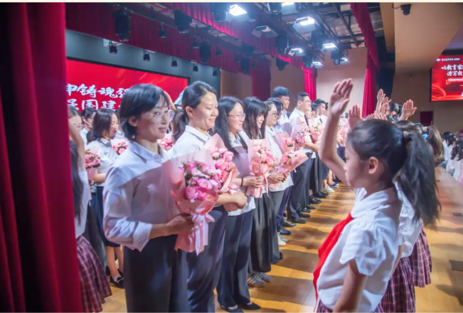 少先队代表们手捧娇艳鲜花,迈着整齐而庄重的步伐,分批次向老师们献花。那一束束鲜花,色彩斑斓,恰似学生们五彩斑斓的感恩之心。孩子们纯真的眼神、恭敬的姿态,老师们欣慰的笑容、感动的泪花,交织成一幅温馨感人的画面,将大会的氛围推向高潮。每一朵鲜花都承载着对老师辛勤付出的敬意,每一句祝福都是对教育之恩的深情诉说。