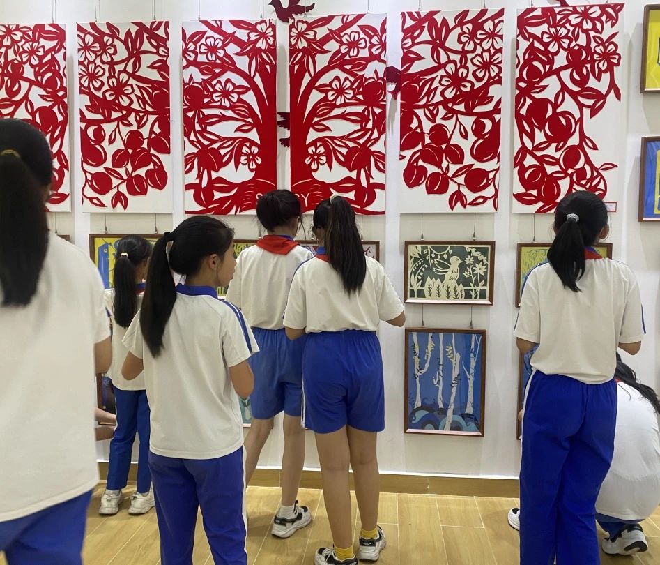 以刀代笔、以纸为媒介,本次展览呈现了《桃李芬芳》《湿地候鸟》《红树林》等系列新作。这些作品围绕庆祝学校成立四十周年以及半日课程的主题,经过精心策划与创作,巧妙地将传统文化与校园特色相结合,通过栩栩如生的剪纸艺术,叙述了校园的精彩故事。