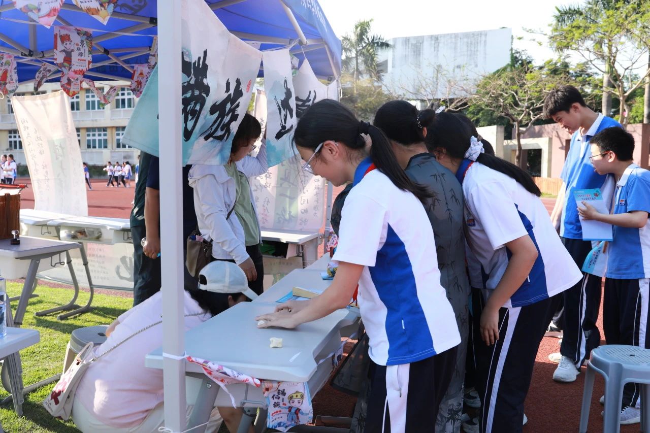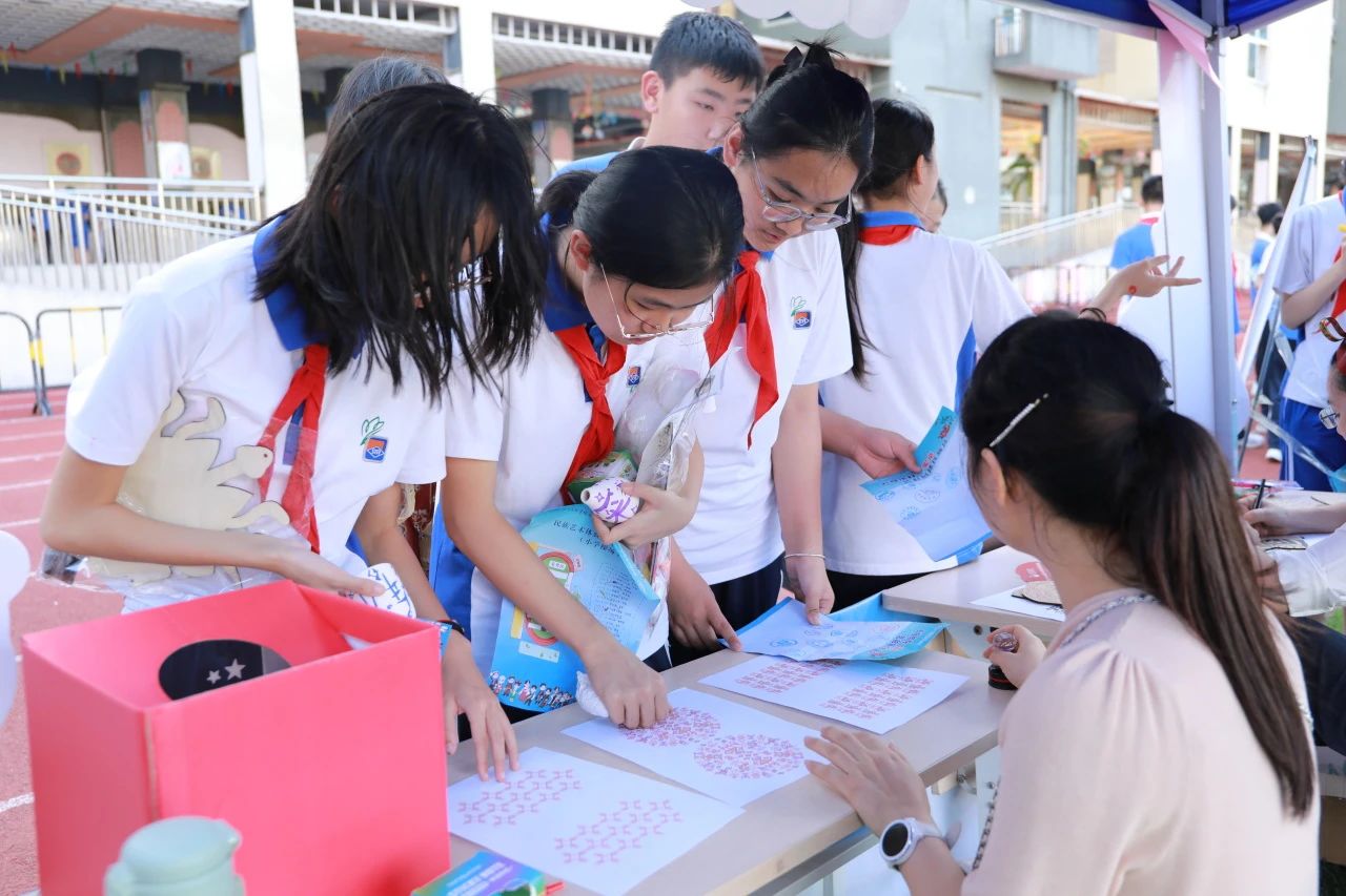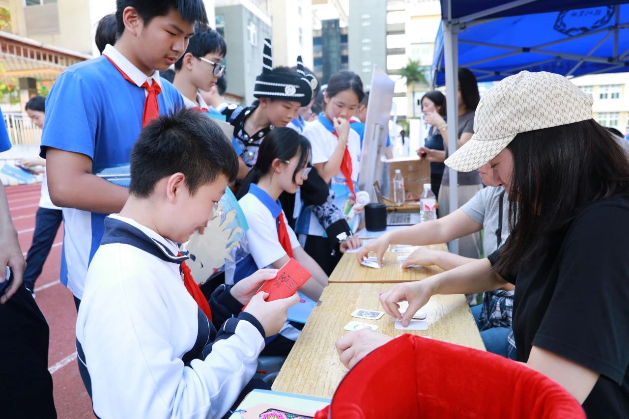 七八年级学生持定制集章卡开启“文化寻宝”之旅。从本班摊位出发,自由穿梭于各民族特色站点,盖章打卡、解锁成就。不少学生惊呼:“原来课本里的‘各美其美’,竟能如此有趣!”