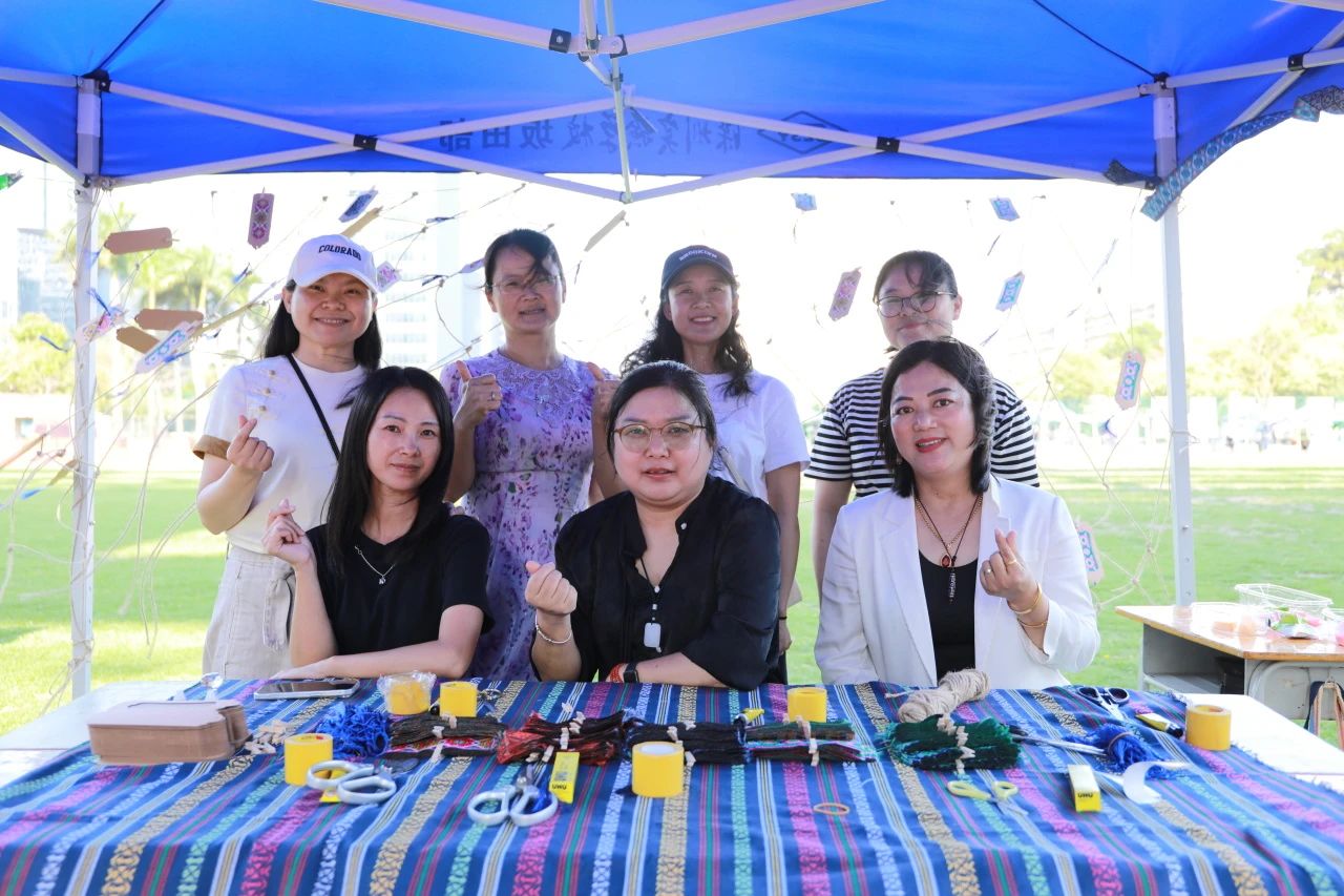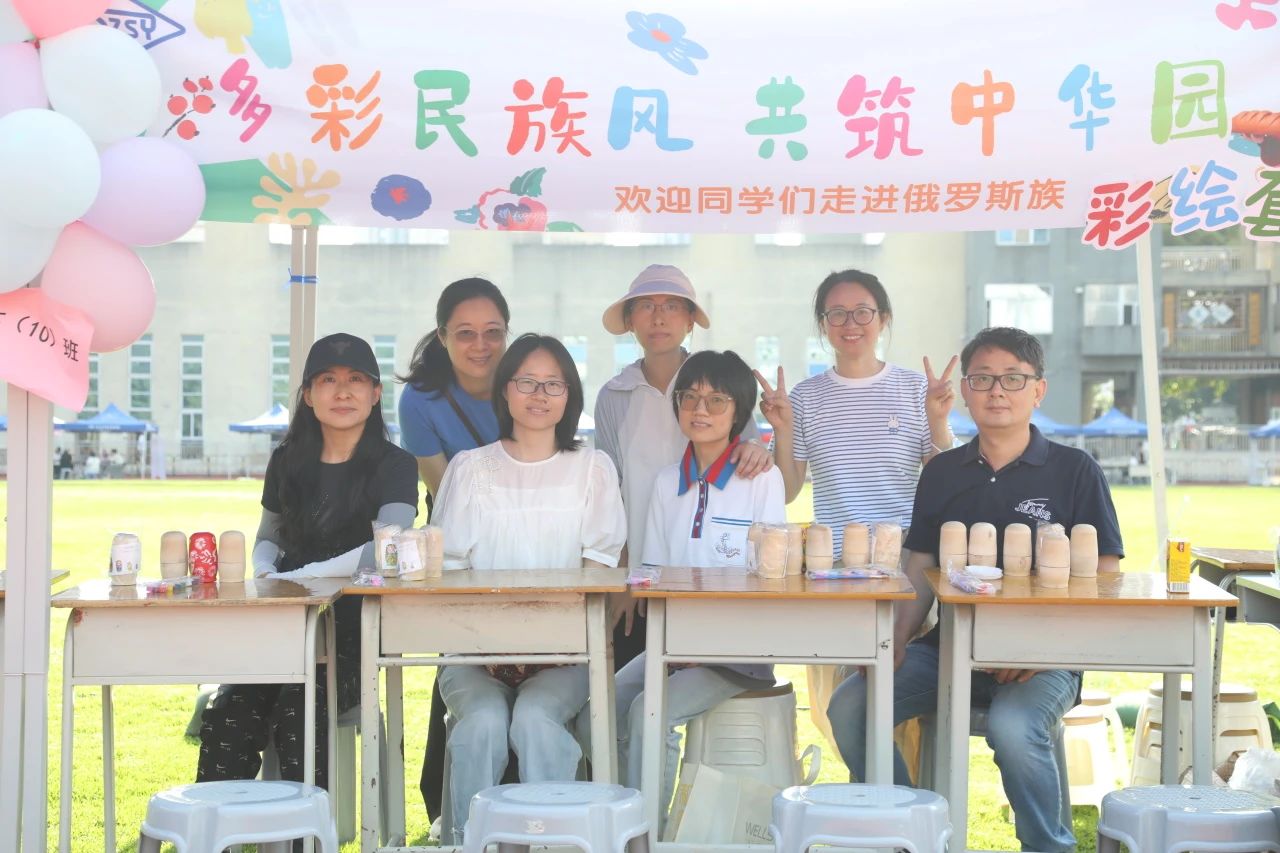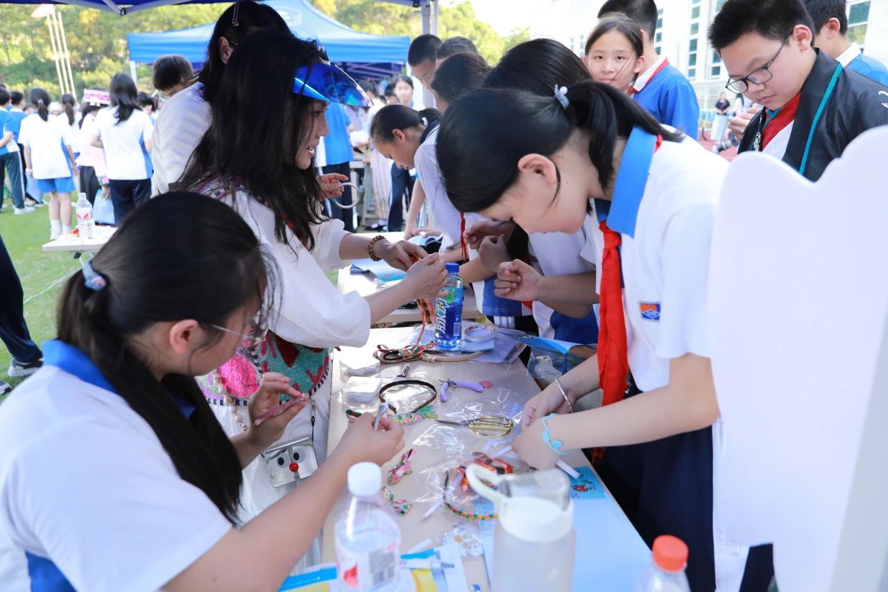 七八年级各班学生和家长们化身“民族文化传承使者”,分别承办着特色鲜明的近四十个民族主题展位,精彩纷呈,创意无限。从民族服饰体验到云端相册留念,从生活物品的手工制作到少数民族文字解密,从民族文化讲解到民族舞蹈观赏、竹竿舞体验、游戏互动……师生们满怀欣喜地穿梭在各班摊位之间,沉浸在各民族文化之中。