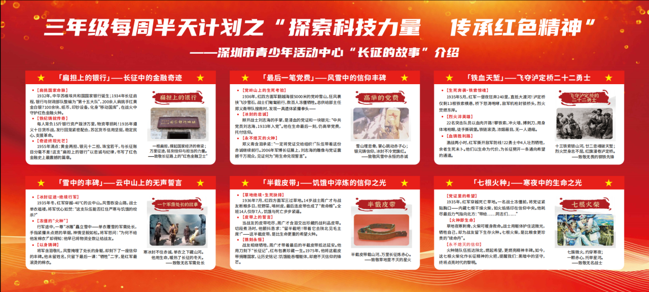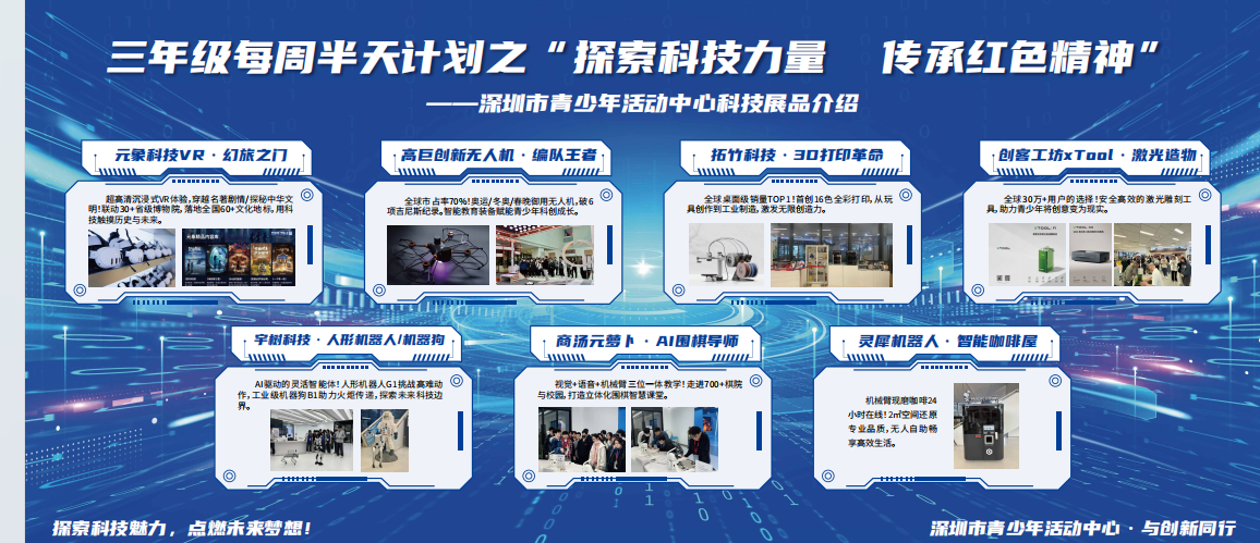 接下来,我们将按照计划认真落实“每周半天计划”各项活动。例如,五月份我们将在深圳青少年活动中心开展三、五、七年级小初系列课程:三年级“探索科技力量,传承红色精神”,通过科技互动与红色文化体验,让孩子们感受科技的力量与革命精神的传承;五年级“科技改变生活,探秘新质生产力”,探索科技如何改变生活,了解新质生产力的奥秘,培养创新思维与实践能力;七年级:“青春圳飞扬,科技创未来”,通过跨学科探究与项目实践,展望科技对未来的深远影响。