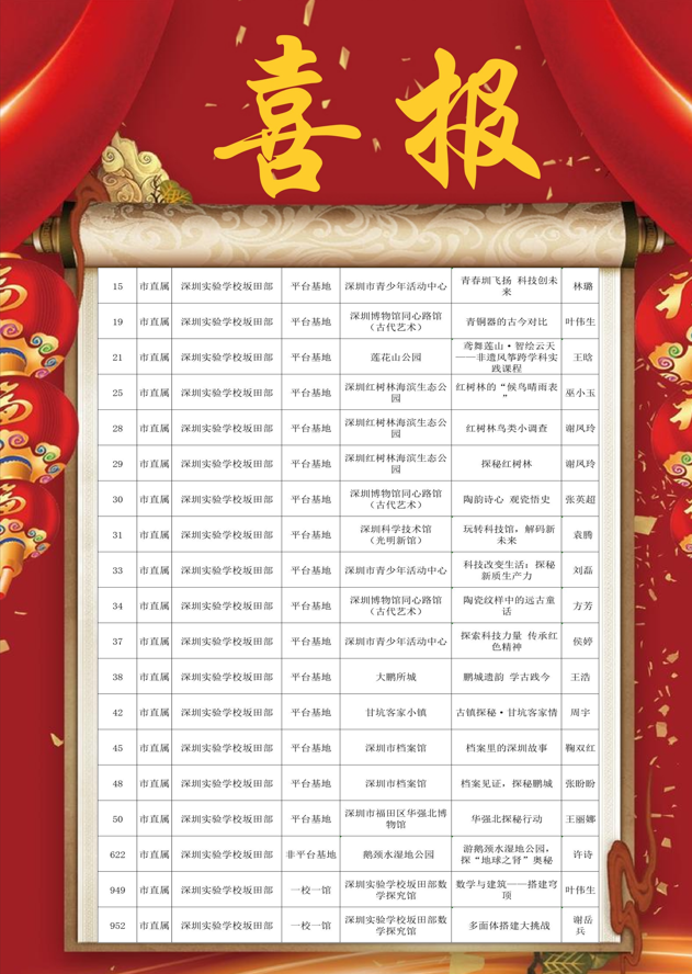 近日,深圳市教科院 2025 年“每周半天计划”课程开发项目评审结果公布,深圳实验学校坂田部共有 19 项课程项目立项,立项数量位居全市前列。这一喜讯,体现了坂田部教师高水准的课程开发能力,极大鼓舞了全体师生探索精神,它将激励我们继续在教育改革的道路上砥砺前行,不断探索教育的新可能。