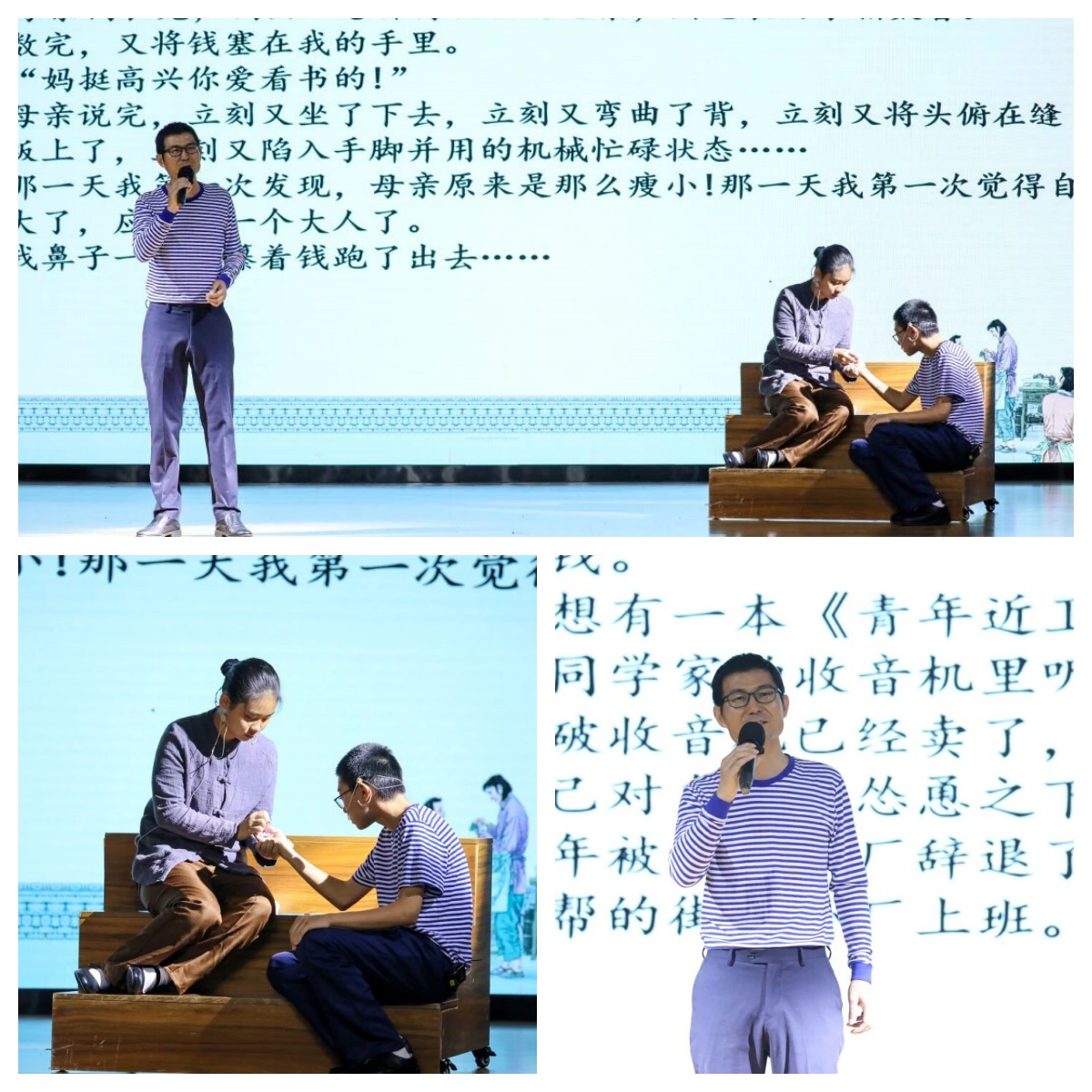 若说朗诵是精神的洗礼,那么接下来的节目便是心灵的震撼。小学教务处主任温荫明携手初中小蜗牛戏剧社,将作家梁晓声笔下的《慈母情深》搬上舞台。“母亲”佝偻的脊背、龟裂的手指,与“儿子”渴望读书却心疼母亲的纠结神情,精准复刻了课文中令人动容的细节。温老师动情的朗诵,当读到 “母亲立刻又坐了下去,立刻又弯曲了背”时,台下不少师生悄悄红了眼眶。这不仅是对经典的演绎,更是对“读书背后是亲情托举”的深刻诠释。