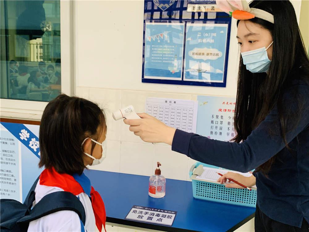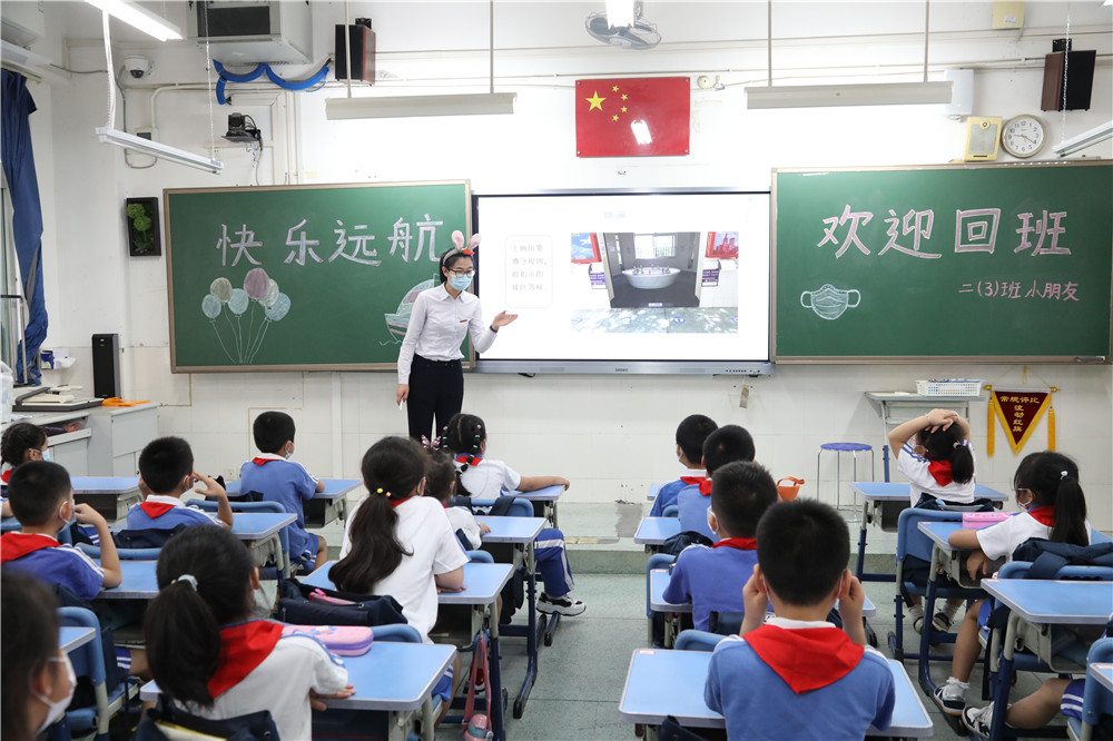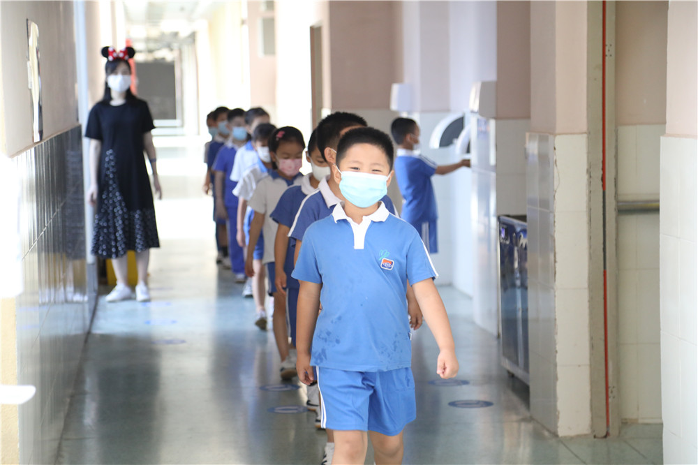 作为低年段学生的家长,我曾一度担心“神兽”在超长假期返校后找不到回班级的路。殊不知我们能想到的,学校老师早已为我们做好了。老师精心制作的“回校旅游路线图”视频给出了清晰的指引。入校、测温、洗手、进教室、去洗手间、打饮用水、到操场集合、去医务室,老师带着孩子们校园“旅游”的同时,还不忘强调防疫注意事项和具体操作。为实验老师们精细务实的作风点赞!
