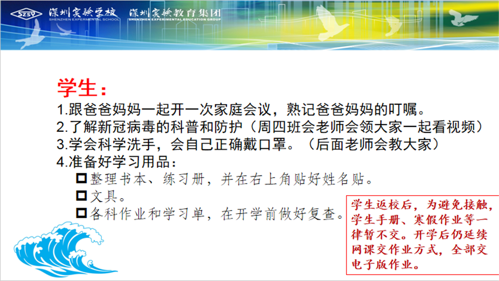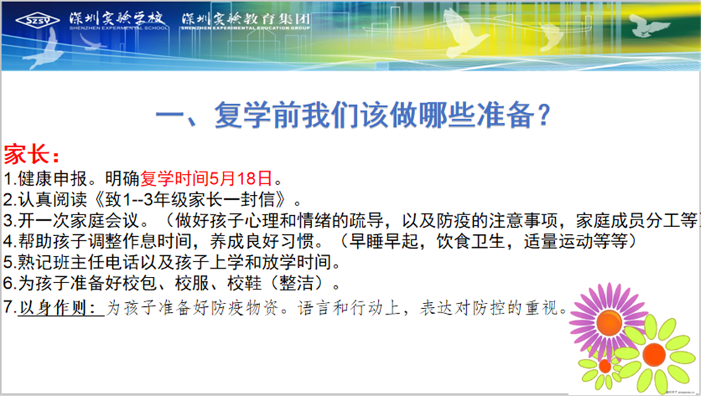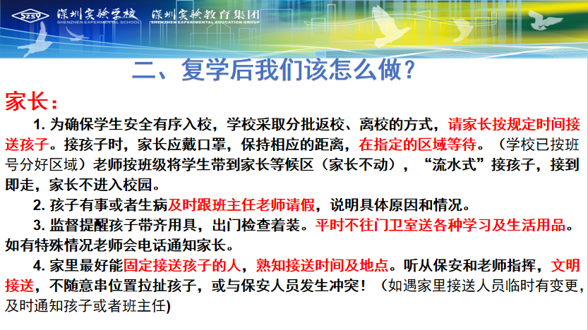 作为家长,我清楚地知道自己还有很多需要学习的地方。复学复课前,老师给家长也布置了“家长作业”,助力学校复学复课。如:合理安排孩子居家日常膳食,调整生物钟,准备学习用具等。同时,学校还就如何改善亲子关系给予了有效指导,强调要重视孩子心理危机的识别与干预,要在疫情防控、复学复课、生命教育三条战线上形成家校合力。