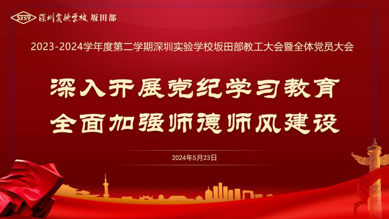 为加强党对教育工作的全面领导,持续提升党员、教工思想认识,进一步规范育人行为,树牢底线意识,提高职业道德素养,2024年5月23日,坂田部召开教工大会暨全体党员大会,开展党纪学习教育和教职工师德师风建设专题活动。