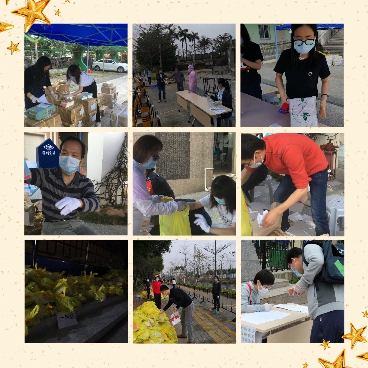 为保证线上教学新课的顺利开课,保证新学期教材安全、及时地发到九个年级每位学生手中,教务处联系书店,提前把教材送至学校;党总支通过战“疫”先锋小程序招募党员志愿者到校参加分书工作;总务处根据学生处统计的未在深学生名单及现居住地,为有需要邮寄新书的学生联系邮政快递及时将新书送达;各年级家委也积极响应学生处号召,到校协助老师为前来领书的家长测量体温,分年级、分时段发放教材。