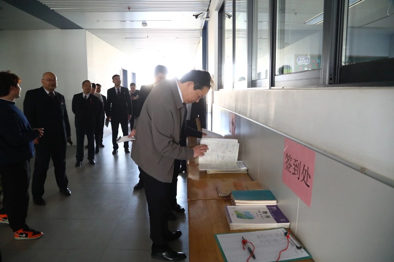 此次调研正值初中部举办教育教学开放周,夏育华书记来到九年级教室门口,认真翻阅学生作业,对学生的状态予以高度肯定。