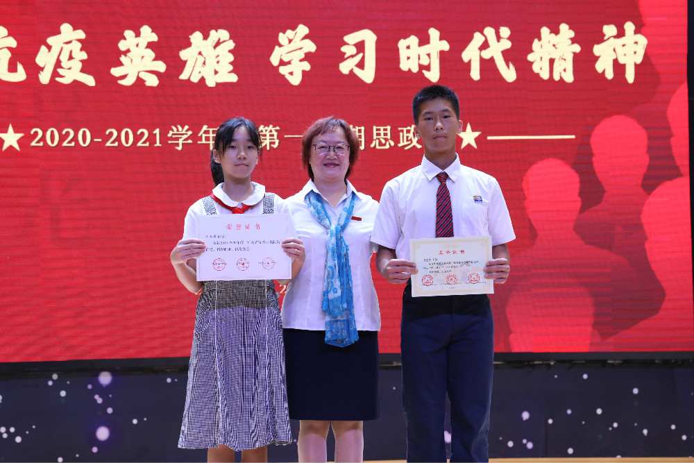 思政课结束前,冯校长为同学们身边的榜样——八(5)班汪雨荷和九(2)班林嘉荣同学颁奖并致颁奖词。汪雨荷同学荣获2019-2020年度“广东省优秀少先队员”称号;林嘉荣同学在深圳市第五届寻找“最美南粤少年”活动中,荣获“活力好少年”提名奖。(文/学生处 图/信息中心)