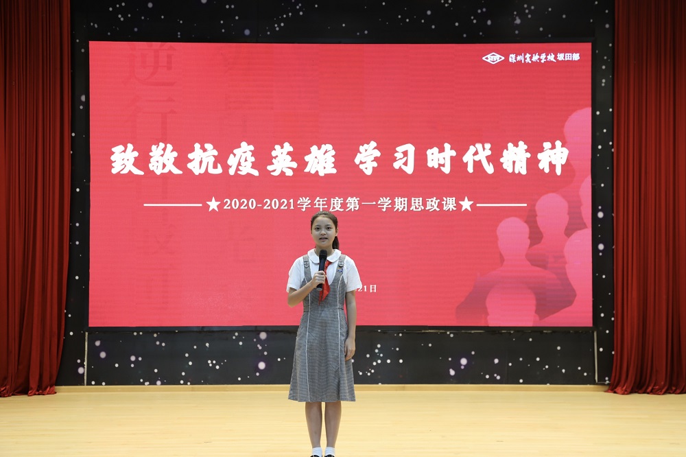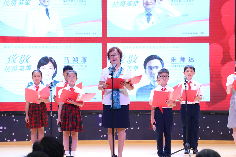抗疫模范是深圳的骄傲。少先队员代表用稚嫩的童声,讲述着深圳抗疫英雄的故事。冯校长强调,中华文化之所以传承千年、不断发展,就是因为中国人历来抱有家国情怀,崇尚天下为公、克己奉公。危难时刻挺身而出的就是英雄。我们城市的医护工作者、公安干警、社区工作者、环卫工人、志愿者……虽然我们无法一一知道他们的名字,但正是无数这样的普通人,以守家即守国的担当,以护国即护家的赤诚,用高科技硬核技术、用无私奉献精神,守护着我们的家园和亲人,助力深圳又快又好地打赢了这场疫情阻击战,才有了城市的安定和我们安全幸福的生活。