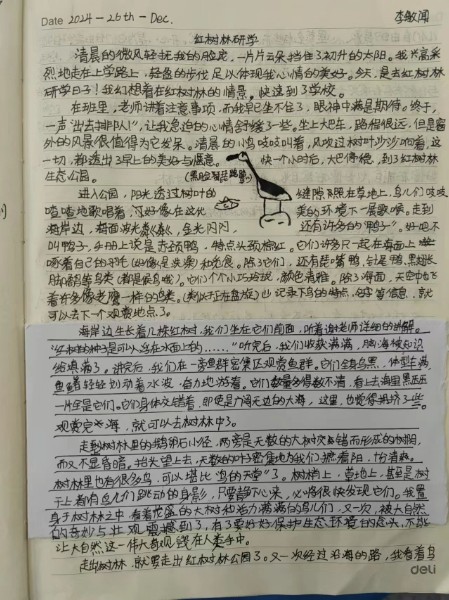 踏入红树林海滨生态公园,就像翻开一本生动的自然百科全书。同学们手持望远镜,在老师的带领下,驻足于岸边。黑脸琵鹭优雅觅食、白鹭振翅高飞、反嘴鹬悠闲散步……孩子们目睹水鸟的灵动,认真地在学习单上记录下水鸟的特征,用画笔描绘出水鸟的优美姿态,并根据观察完成了相关的学习任务,仿佛自己成为了专业的鸟类研究员。每一次观察,每一个新发现,都在他们心间种下好奇与探索的种子。