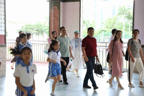 下午3:00,在坂田校区行政干部的陪同下,考察团参观校园。叶伟生主任带领嘉宾们游览小学部展览馆、艺术长廊和“奇萌园”,为嘉宾们介绍美育课程和综合活动课程实施情况。随后,嘉宾们通过跨街操场来到初中部,赵晓主任为大家介绍了校园文化建设、场馆优化利用、精品社团打造等方面的做法和经验。