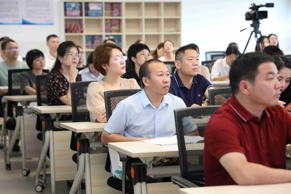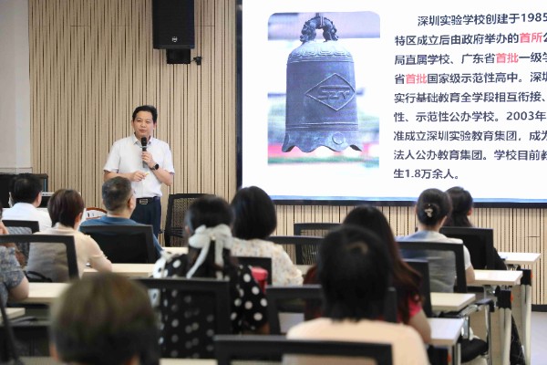 最后,夏育华书记在四楼教师研讨室为考察团做了题为《健全人格教育的深实探索——深圳实验教育集团调研后的几点思考》的专题讲座。夏书记介绍了深圳实验学校教育集团的组织构架,梳理了38年来从“借址办学”到如今集团八部一园的发展脉络,分享了“文化立校”的集团化办学经验。
