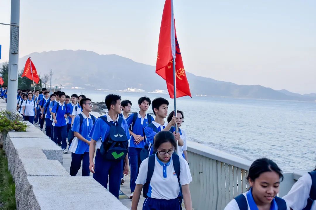 行军拉练即将开始,王喜峰校长和学生处唐艳春主任为九年级各连队授旗。15公里、持续4小时的团队拉练,九年级师生们尽情挥洒汗水,努力咬牙坚持,最终抵达终点。当看到大海的那一刻,大家的喜悦与自豪油然而生。行军拉练,付出的是汗水,收获的是勇往直前,战胜困难的信心与决心。