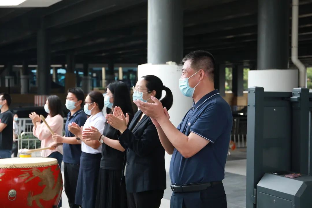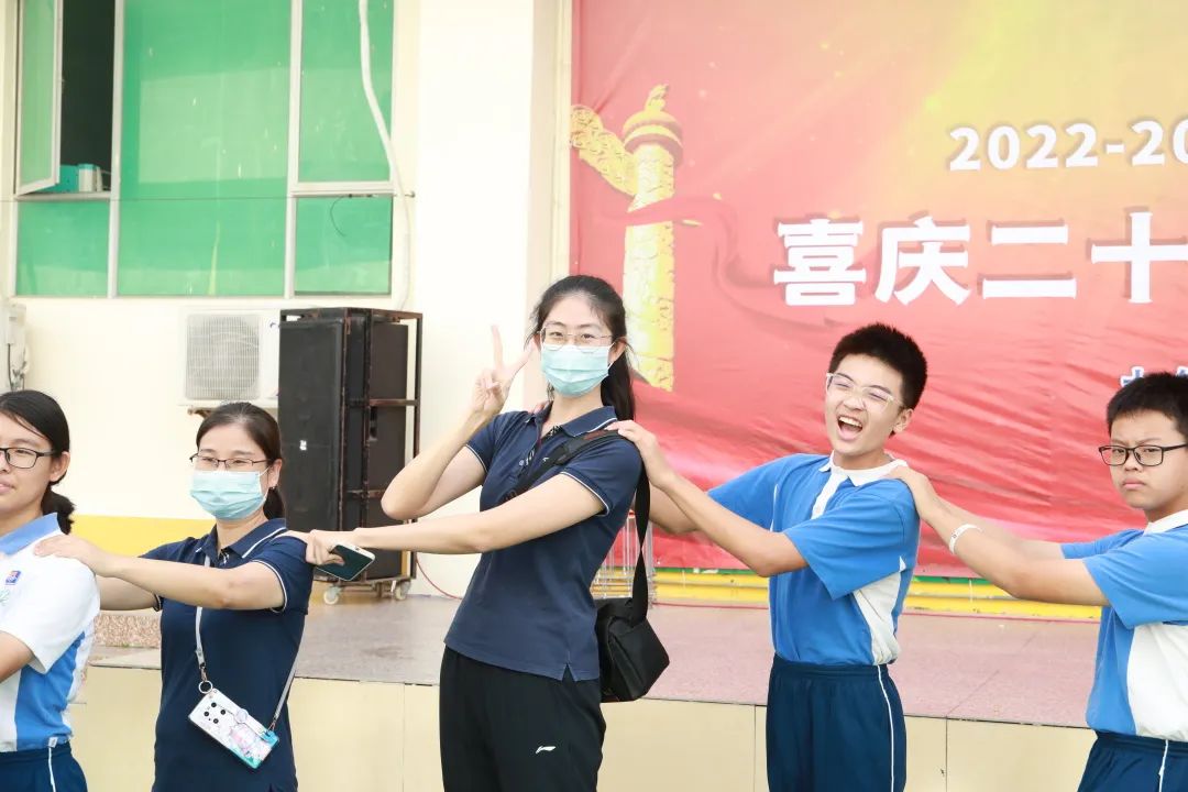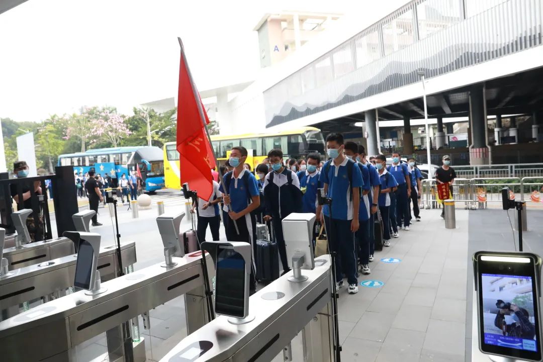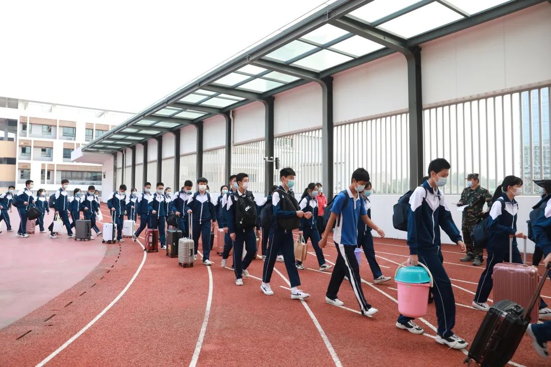 回到熟悉的校园,老师们在校门口热情迎候。同学们向教官表达感谢之情并合影留念。