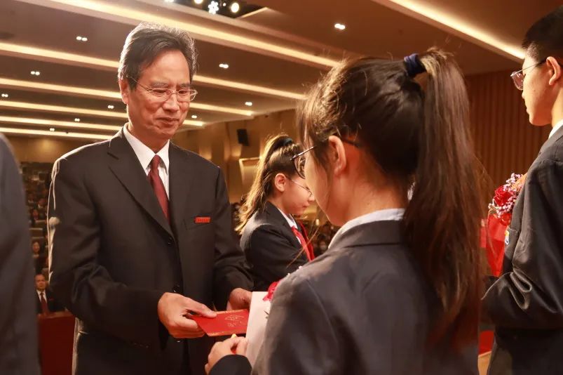 伴随着悠扬的深圳实验学校校歌音乐,校区初中部赵晓主任隆重为每一位获得“实验学校奖奖学金”的同学宣读颁奖词。获奖同学及家长依次走过红地毯,走向主席台。深圳实验学校校长衷敬高为获奖同学颁发证书及奖学金,王喜峰校长向家长颁发感谢状。七年级学生代表为家长献上鲜花。