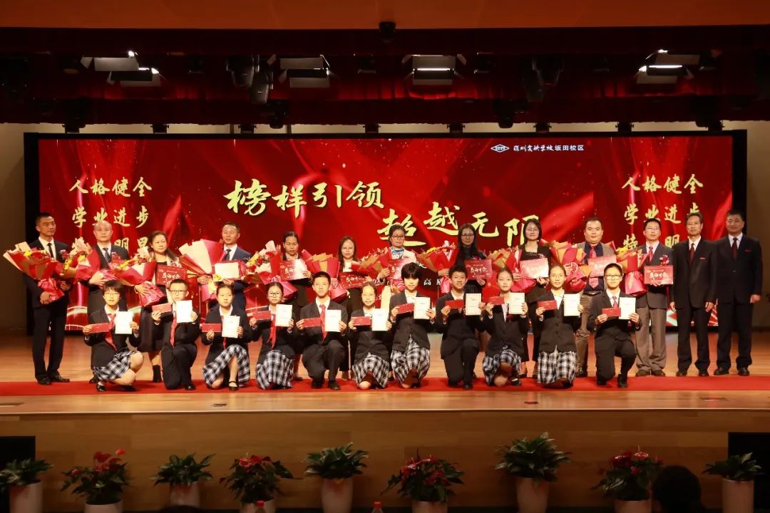 深圳实验学校副校长、坂田校区执行校长王喜峰为12位荣获2023年“实验学校奖奖学金”提名奖的同学颁发荣誉证书并合影留念。