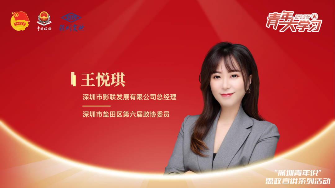 第一位宣讲人是王悦琪。王悦琪,深圳市影联发展有限公司总经理,深圳市盐田区第六届政协委员,2013年就读于香港理工大学城市可持续发展专业,获理学硕士学位,2014年任职于香港佳兆业集团控股有限公司总裁办,2016年担任深圳市南方科技大学书院辅导员兼书院设计总监,后赴美国华盛顿大学圣路易斯分校任职,2019年回国,先后担任深圳市盐田区知联会副会长、盐田区海归协会理事。