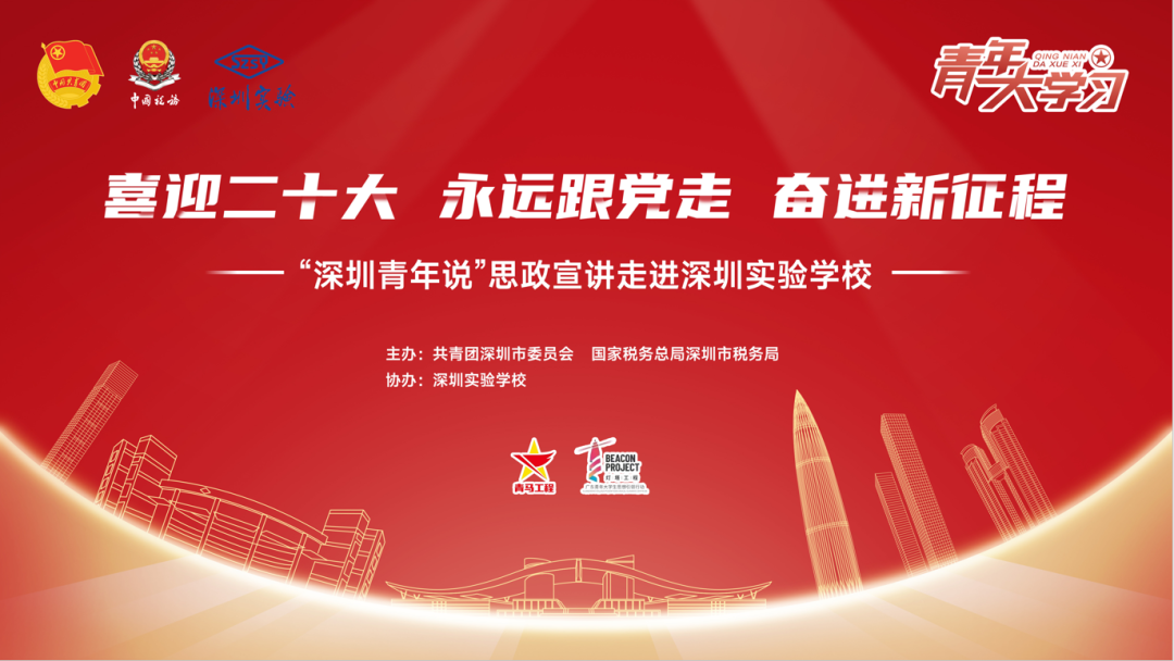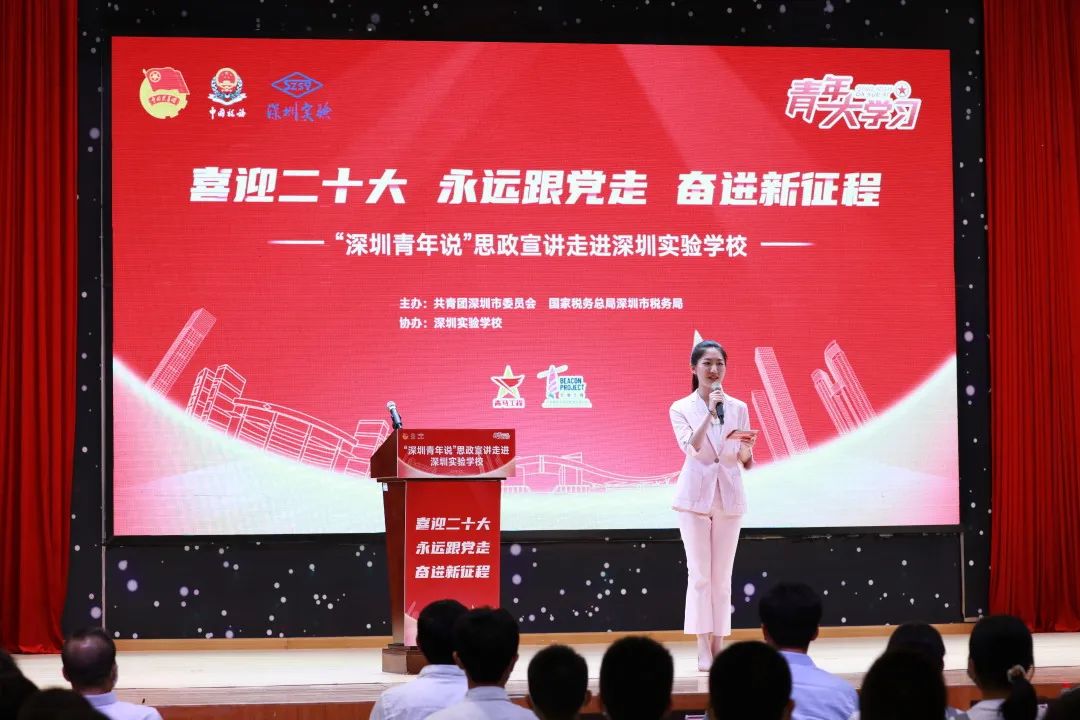共青团深圳市委员会副书记赖锋,国家税务总局深圳市税务局党委委员、总会计师杨庆,深圳实验学校坂田校区初中部负责人吴立刚等领导出席了活动。坂田校区近200名师生到现场聆听宣讲,近700人在线同步观看直播。
