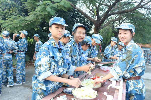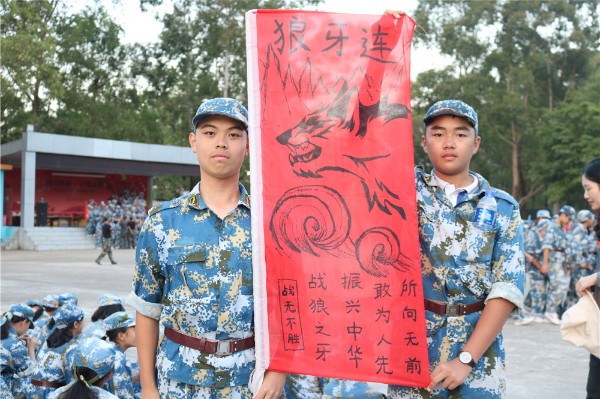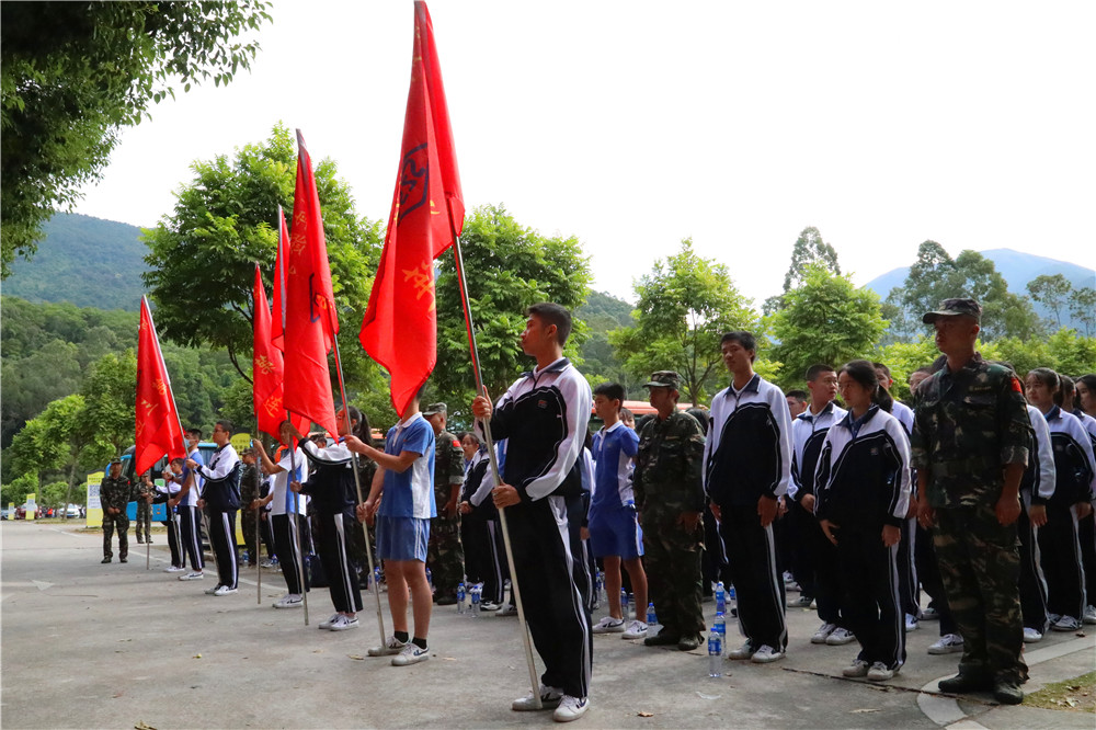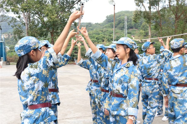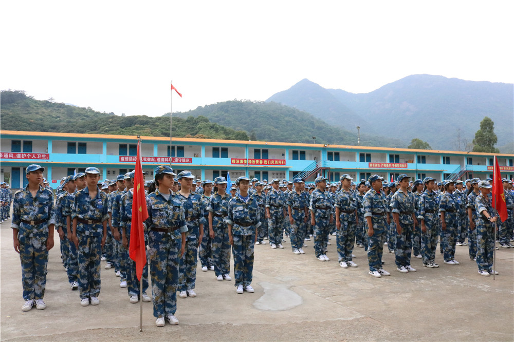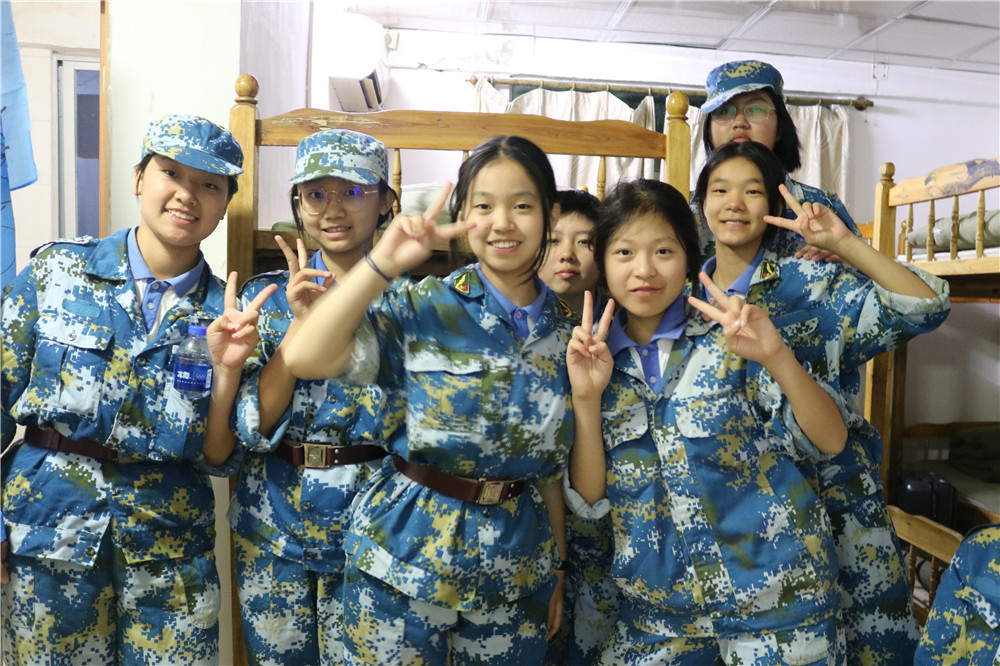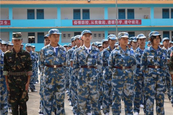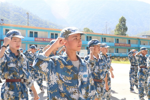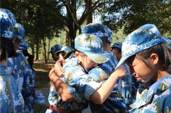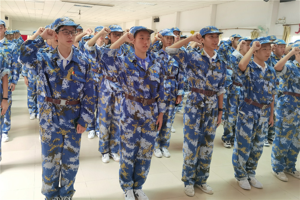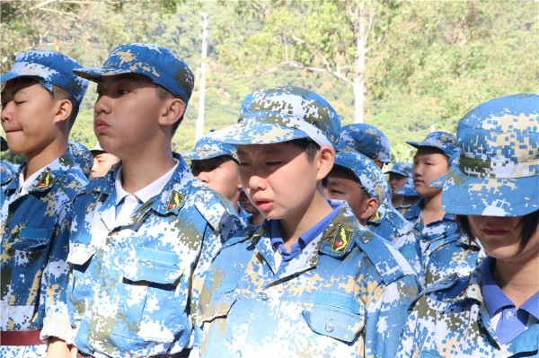 9日上午八时,师生整装出发。一个小时后,顺利抵达基地。稍作整顿后,同学们换上统一的迷彩服参加了开营仪式。