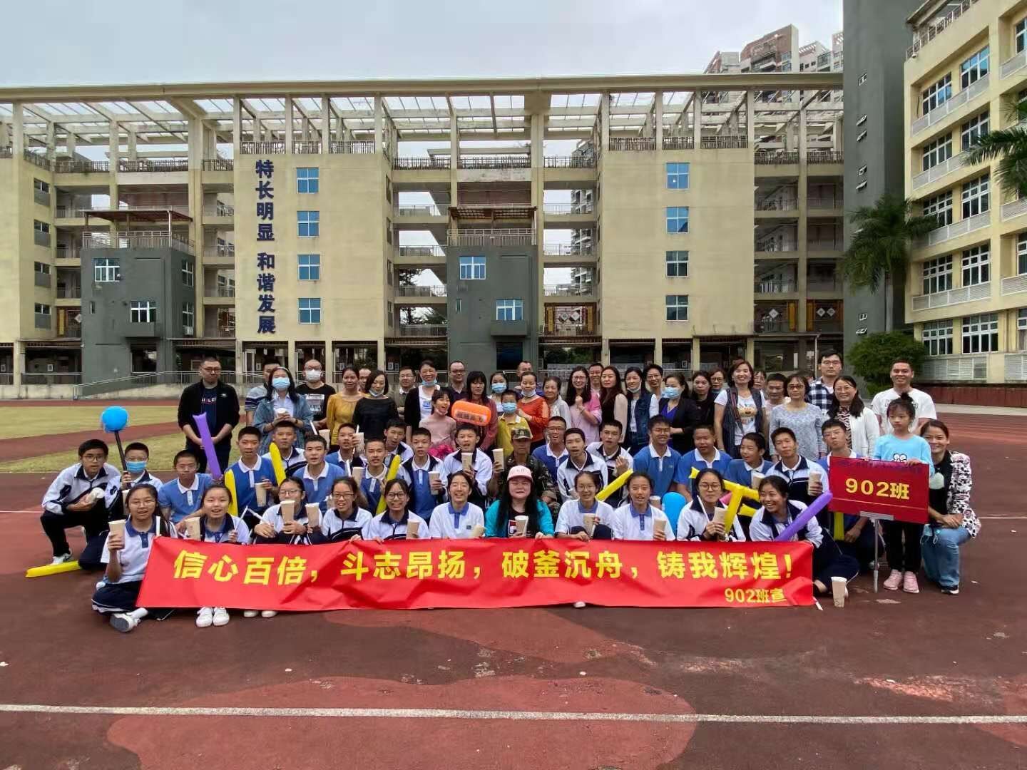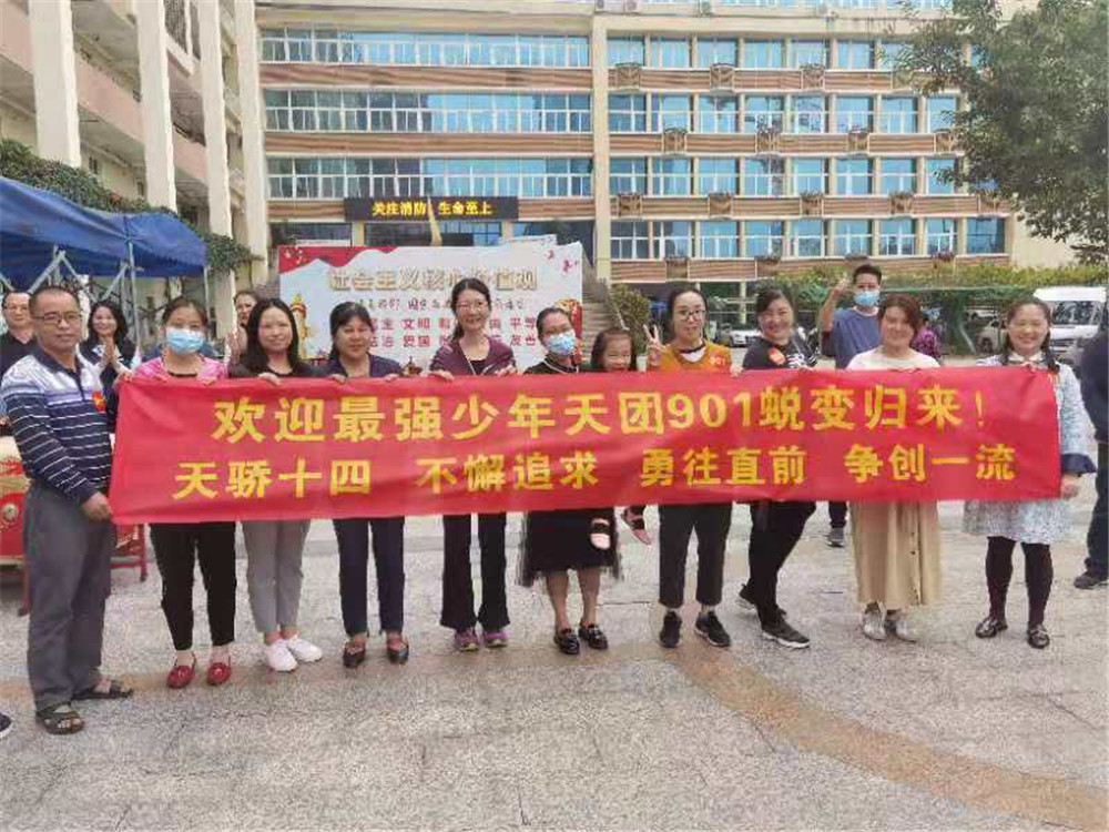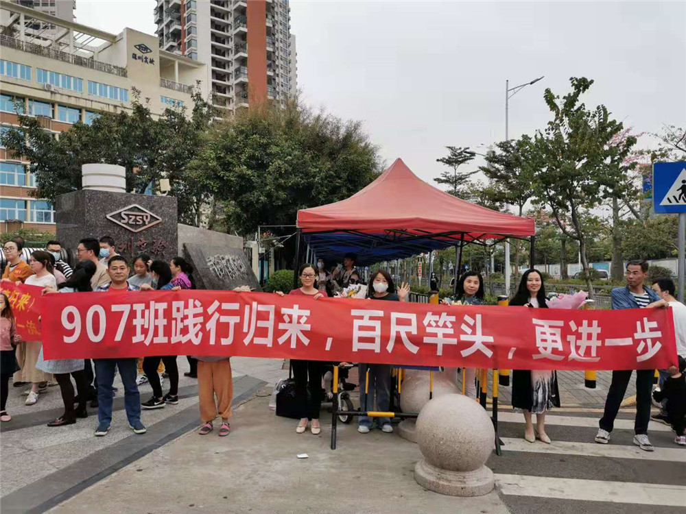 下午三时,九年级师生返回学校,行政、教师代表和各班家委用鲜花和鼓声迎接大家的归来。